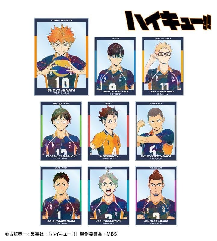 日向翔陽、影山飛雄、月島蛍、山口忠、西谷夕、田中龍之介、澤村大地、菅原孝支、東峰旭を新たなタッチで魅力的に表現し、アクリルカードに仕上げました。