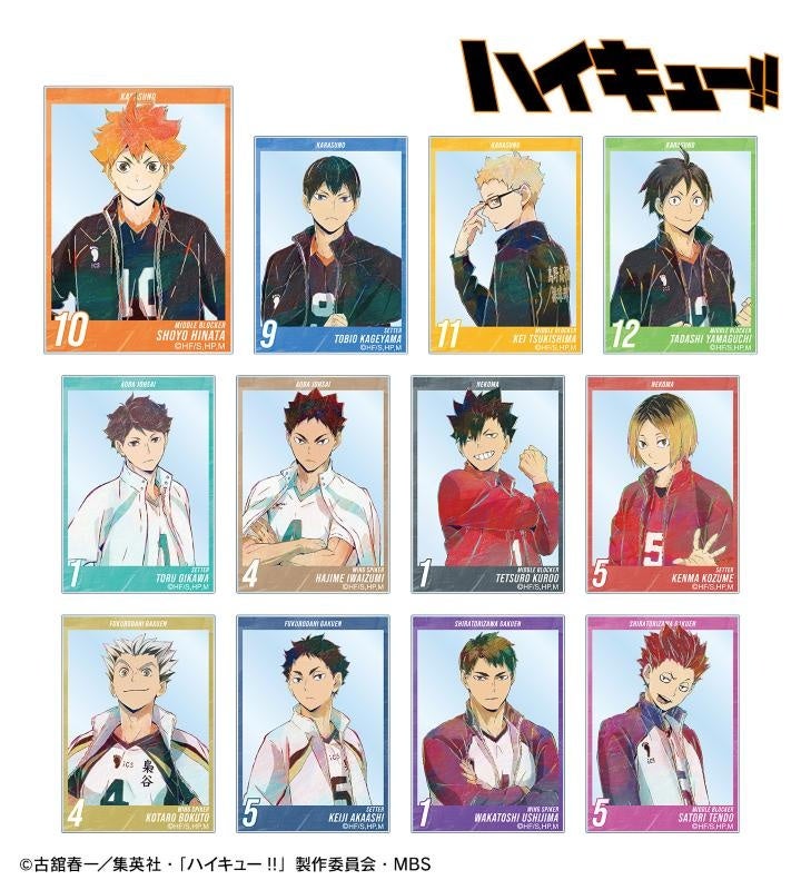 日向翔陽、影山飛雄、月島蛍、山口忠、及川徹、岩泉一、黒尾鉄朗、孤爪研磨、木兎光太郎、赤葦京治、牛島若利、天童覚を新たなタッチで魅力的に表現し、アクリルカードに仕上げました。