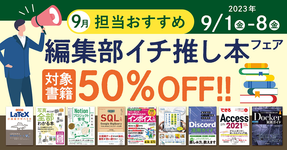 「この本をぜひ読んでほしい!」そんな編集者の熱い気持ちをお届けする、お得な電子書籍セール「担当おすすめ!編集部イチ推し本フェア」。インプレスブックスで販売している電子書籍を対象として50%オフで販売いたします。IT、デザイン、ビジネス、写真撮影など、幅広いジャンルから毎月、編集者の「今だからこそおすすめしたい良書」をご紹介していきます。おすすめポイントをまとめた編集者のコメントも掲載しておりますので、ぜひ購入の参考にしてください。
