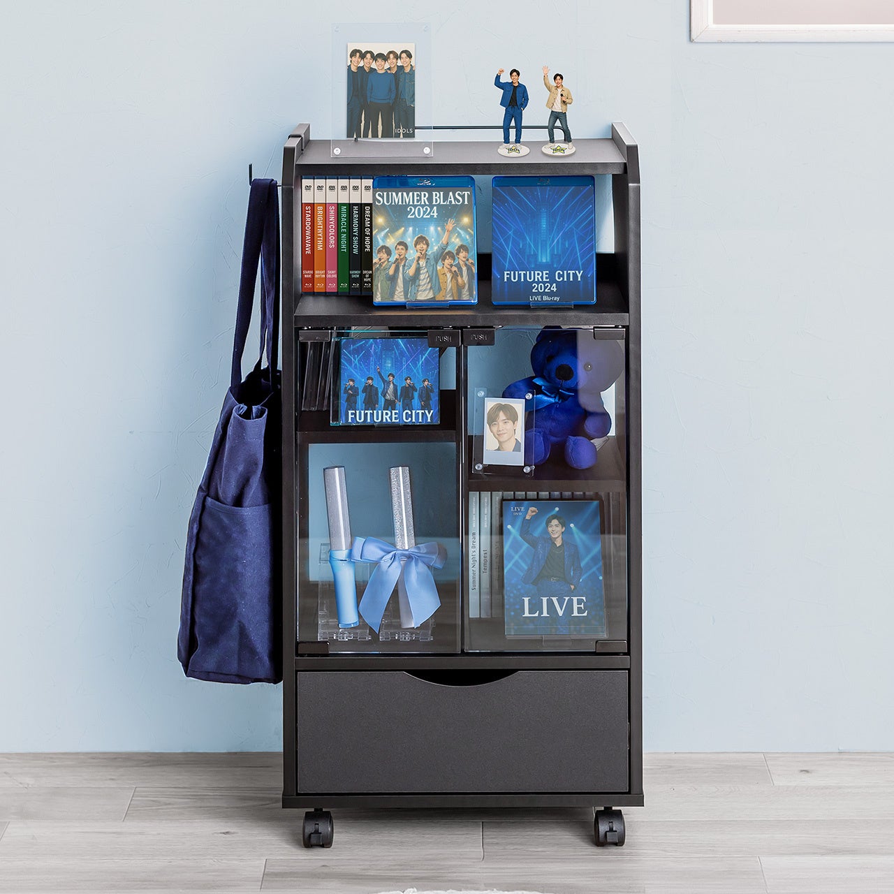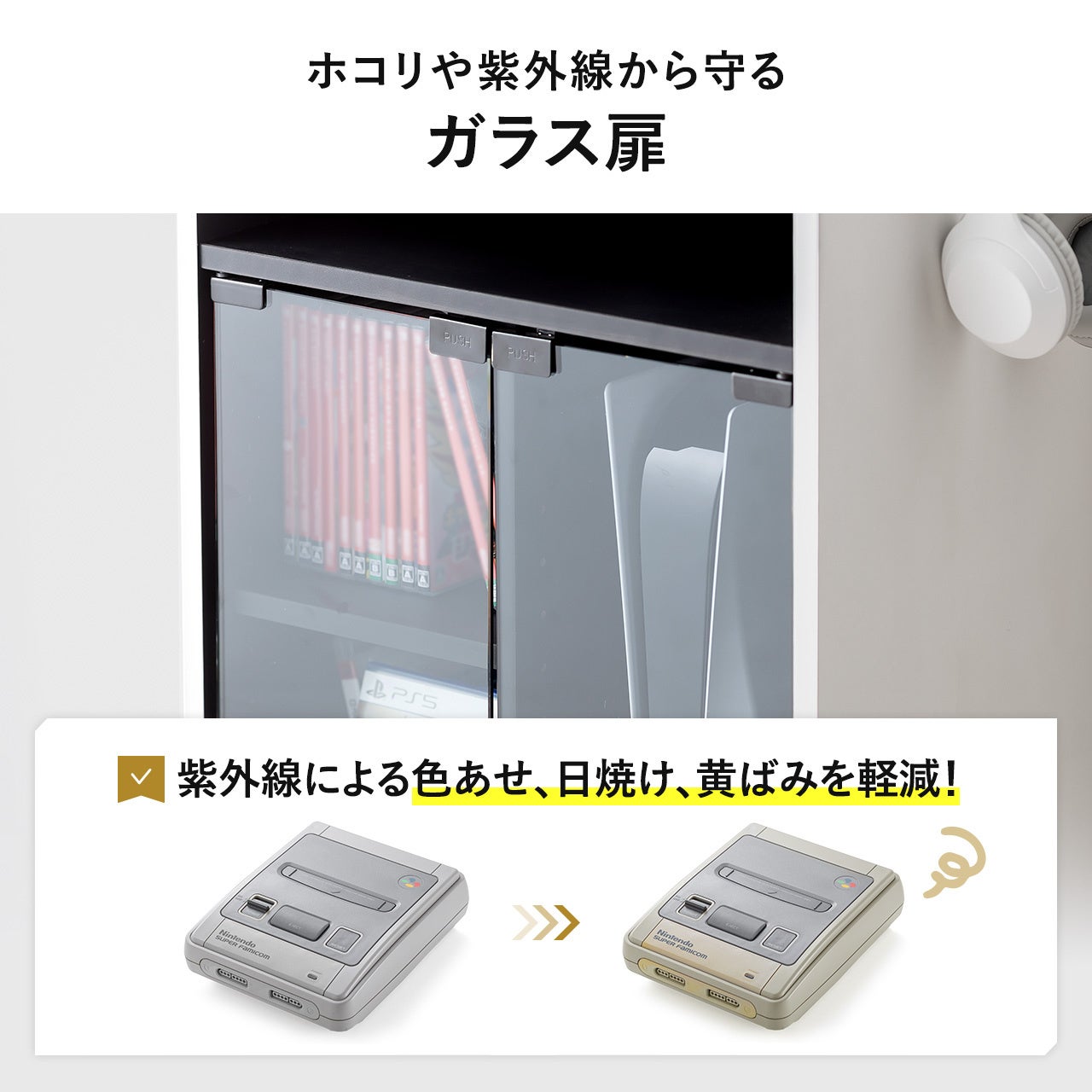 落下防止ストッパー付きなので、収納機器の落下を防ぎます。ホコリや紫外線から守るガラス扉は、プッシュ式で開閉が楽にできます。大切な推し活グッズの収納にもおすすめです。