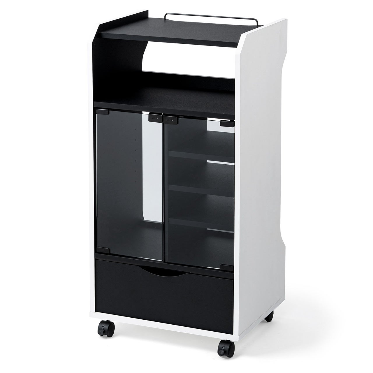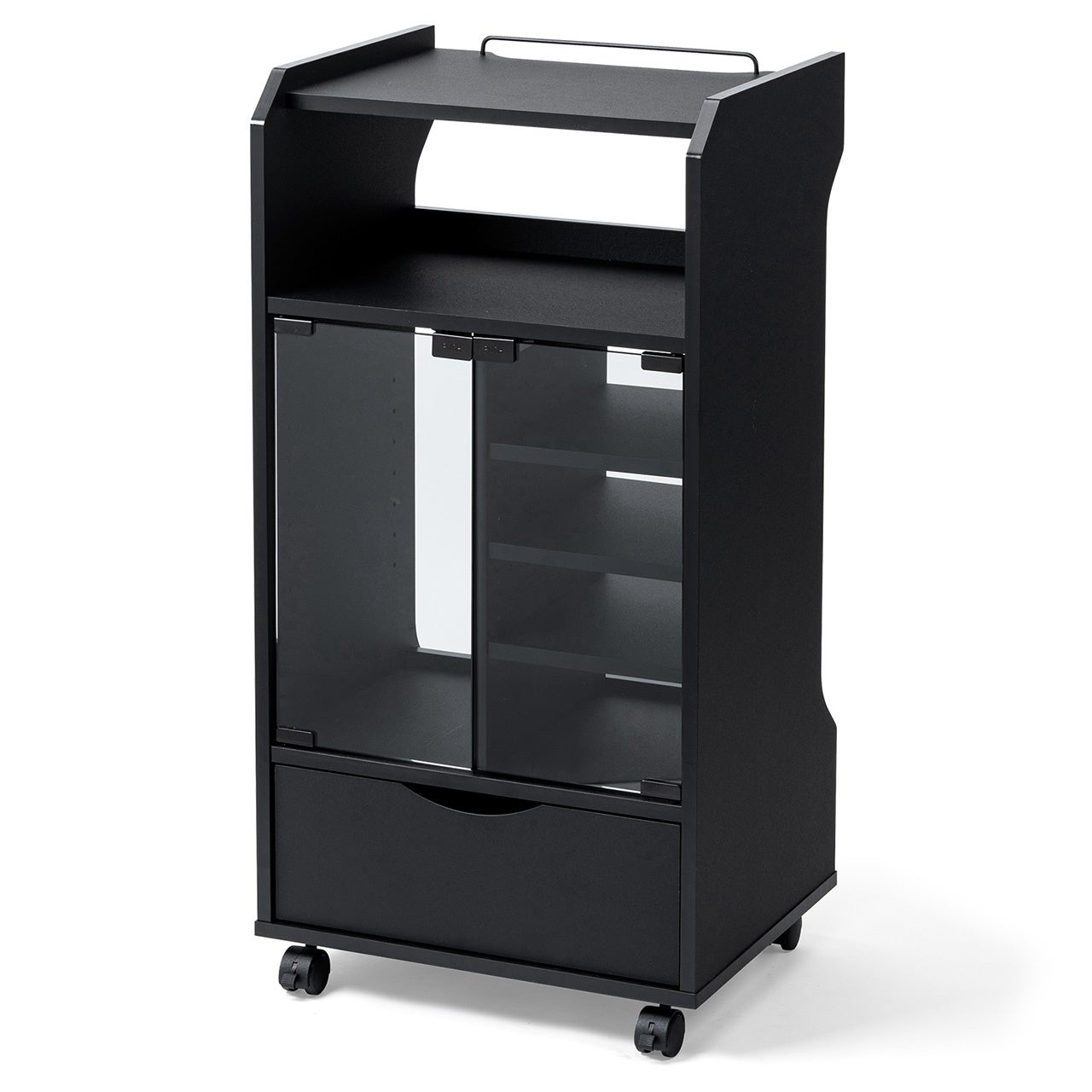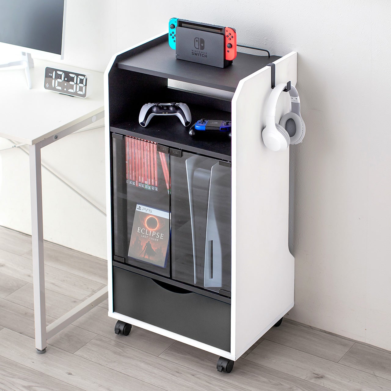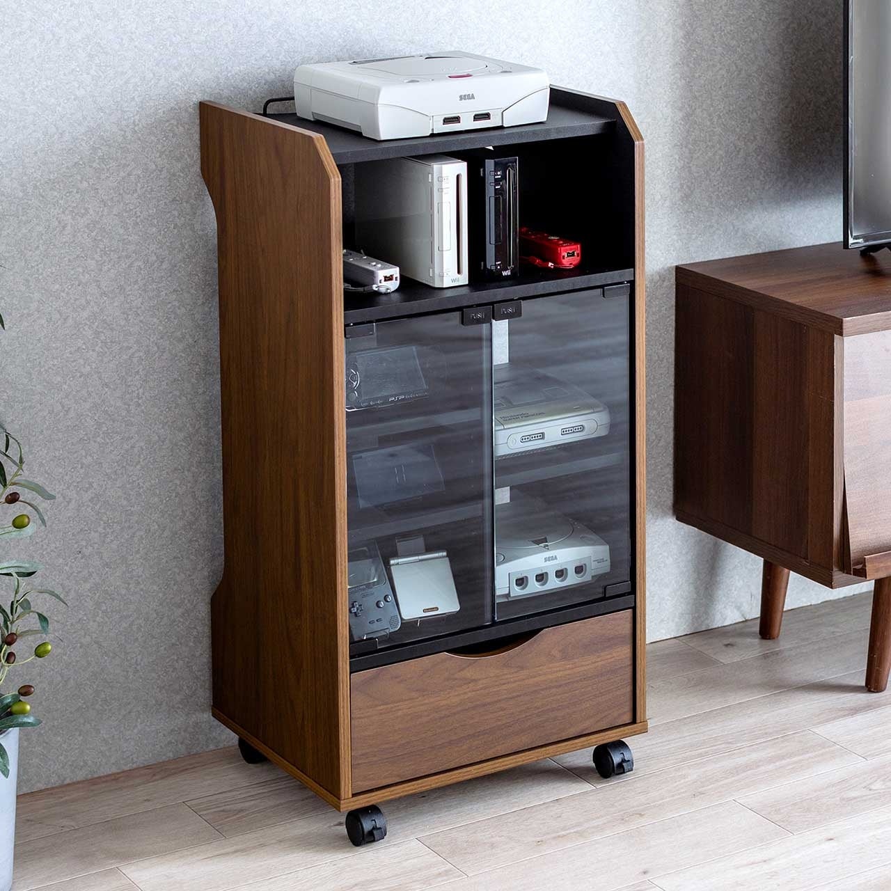 ゲーム機収納ラック ガラス扉 UVカット 可動棚×3枚 キャスター付き サイドワゴン 幅46.2×奥行き37×高さ90cm PS5/4 Switch 2 レトロゲーム機