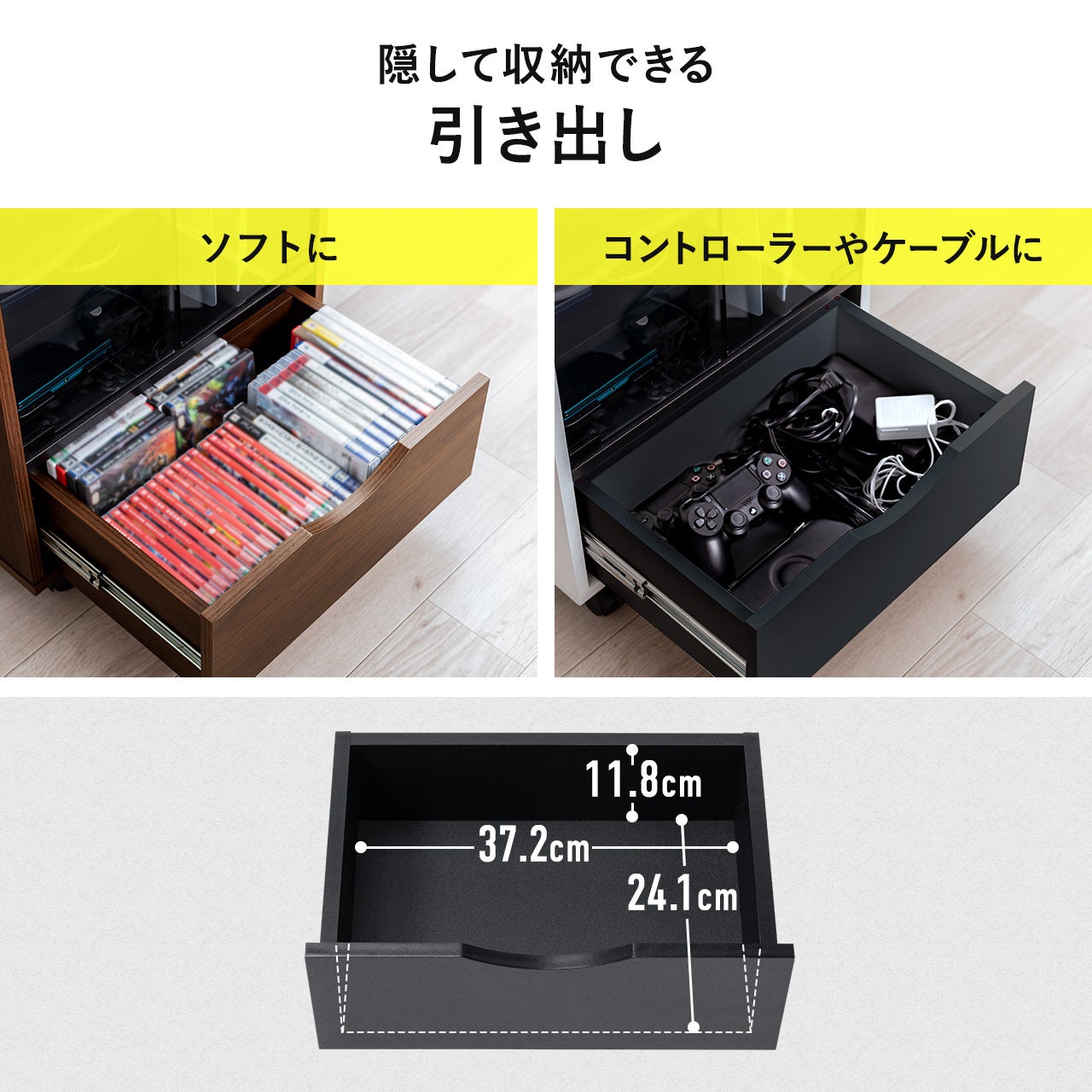 高さを7段階、3.2cmピッチで調整できる中棚が3枚付属しています。ソフトやケーブルを収納できる引き出しは、目隠し収納に最適です。