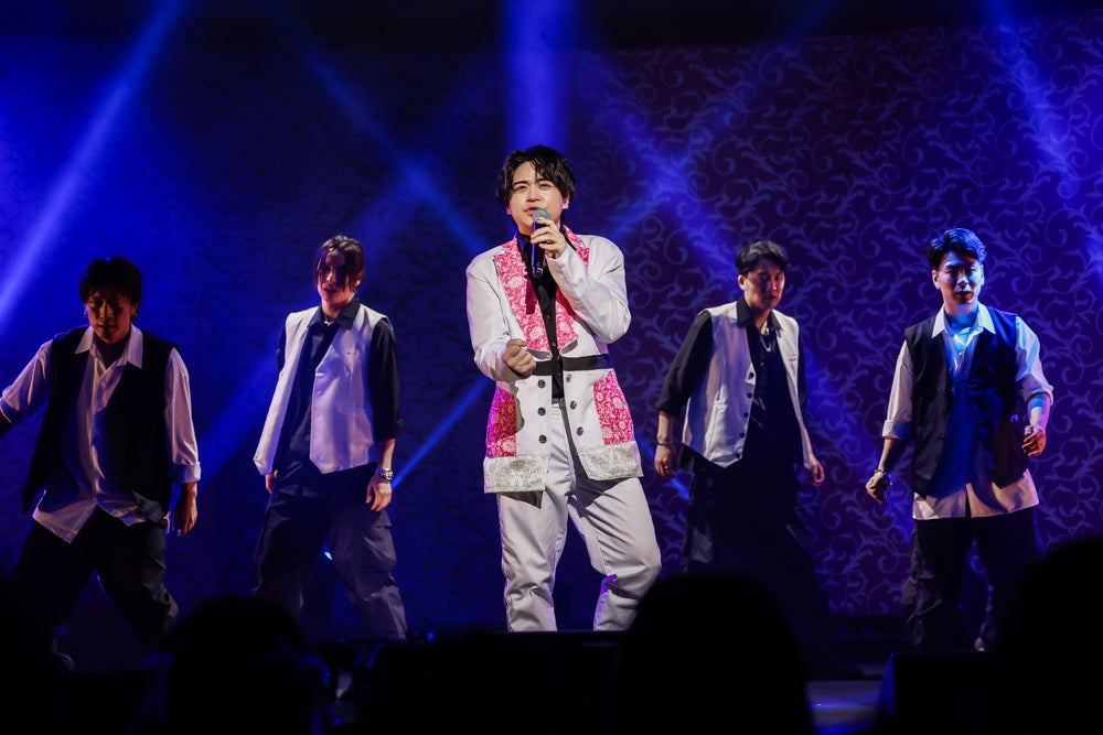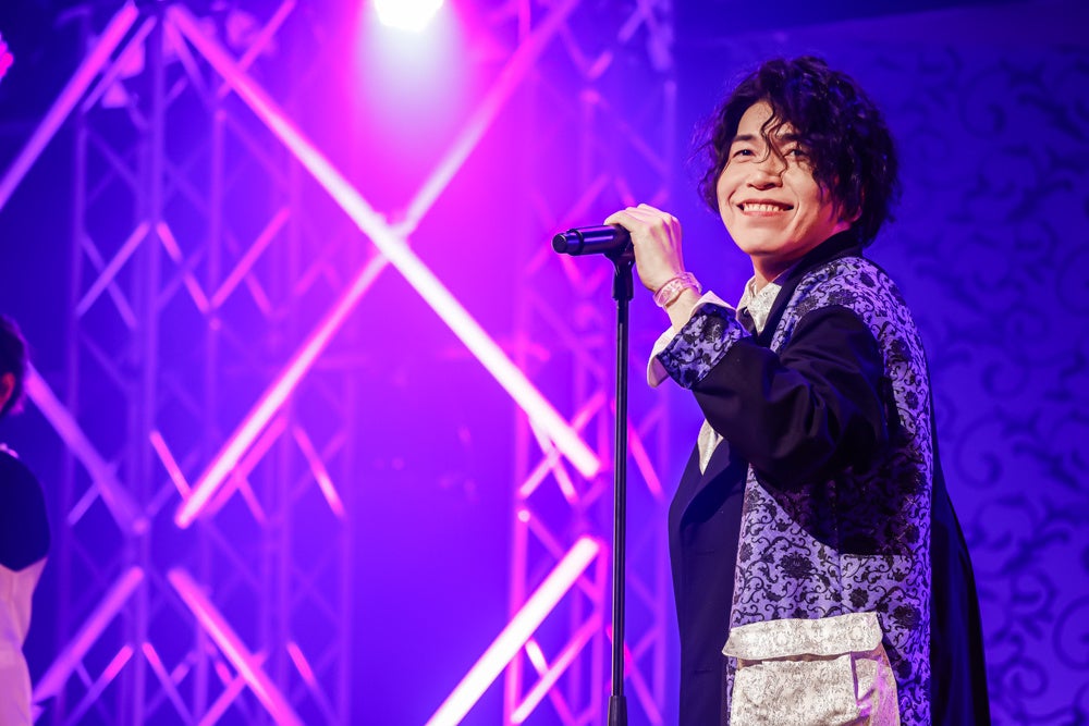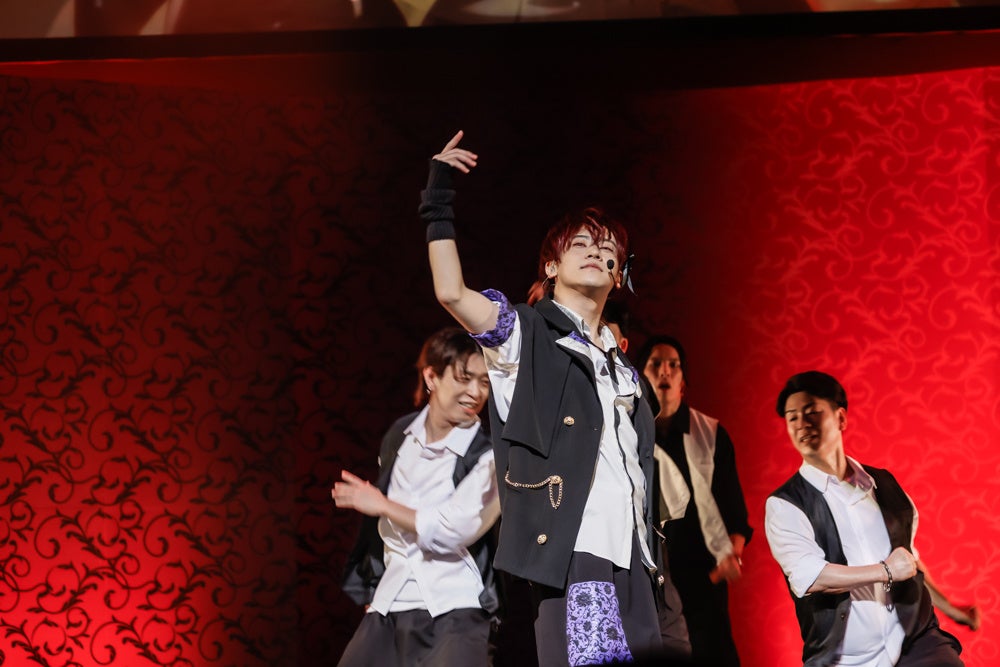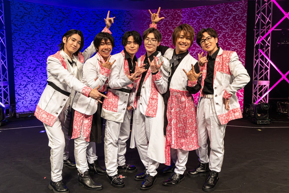 白×ピンク×黒の華やかな衣装を纏った菊池幸利さん(小野田 翔役)、長谷川芳明さん(久慈川悠人役)、佐藤拓也さん(天羽玲司役)、坂 泰斗さん(立花 歩役)、増元拓也さん(大黒 岳役)、河本啓佑さん(名積ルカ役)がユニット曲「Asterism⁂」を歌い上げ、会場の熱を高めます。