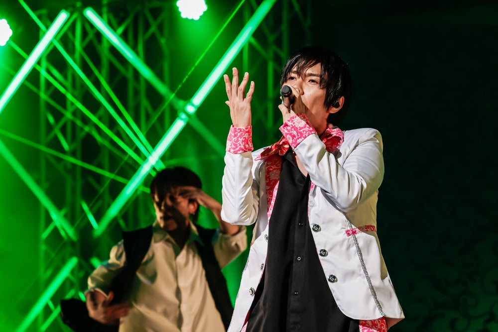 エメラルドのライティングに身を委ねる佐藤さんが天羽玲司の「Illusion×Kiss」で色気たっぷりの歌声を震わせ、立花 歩の「Stay」では彼が持つ芯の強さと信念を坂さんが熱くクールに表現。