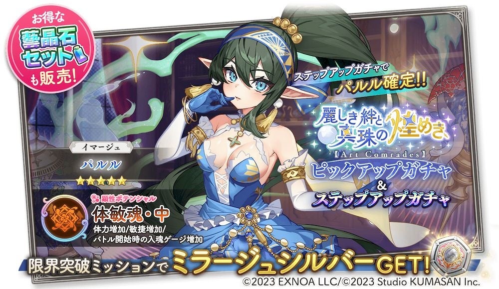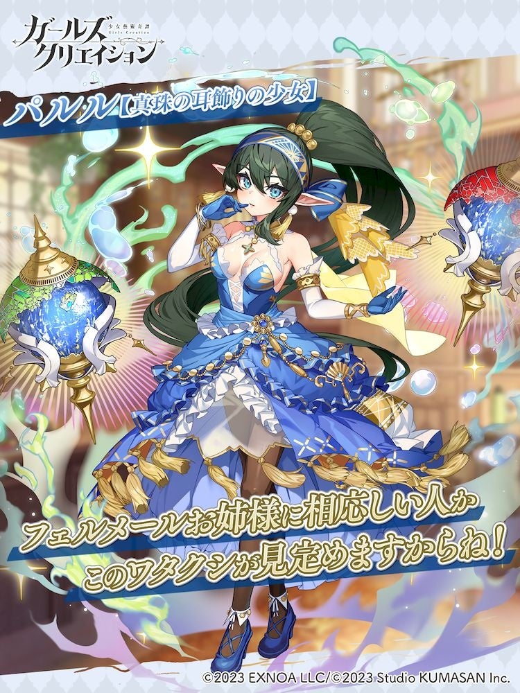 合同会社EXNOA(本社:東京都港区、CEO:村中 悠介、URL:https://games.dmm.com/)が運営するDMM GAMESにおいて、「クリエイティブチーム くまさん」第4弾作品となる『ガールズクリエイション -少女藝術綺譚-』(以下、『ガールズクリエイション』)にて、新イベントと、★5イマージュ「パルル」が新登場のピックアップガチャを開催いたします。