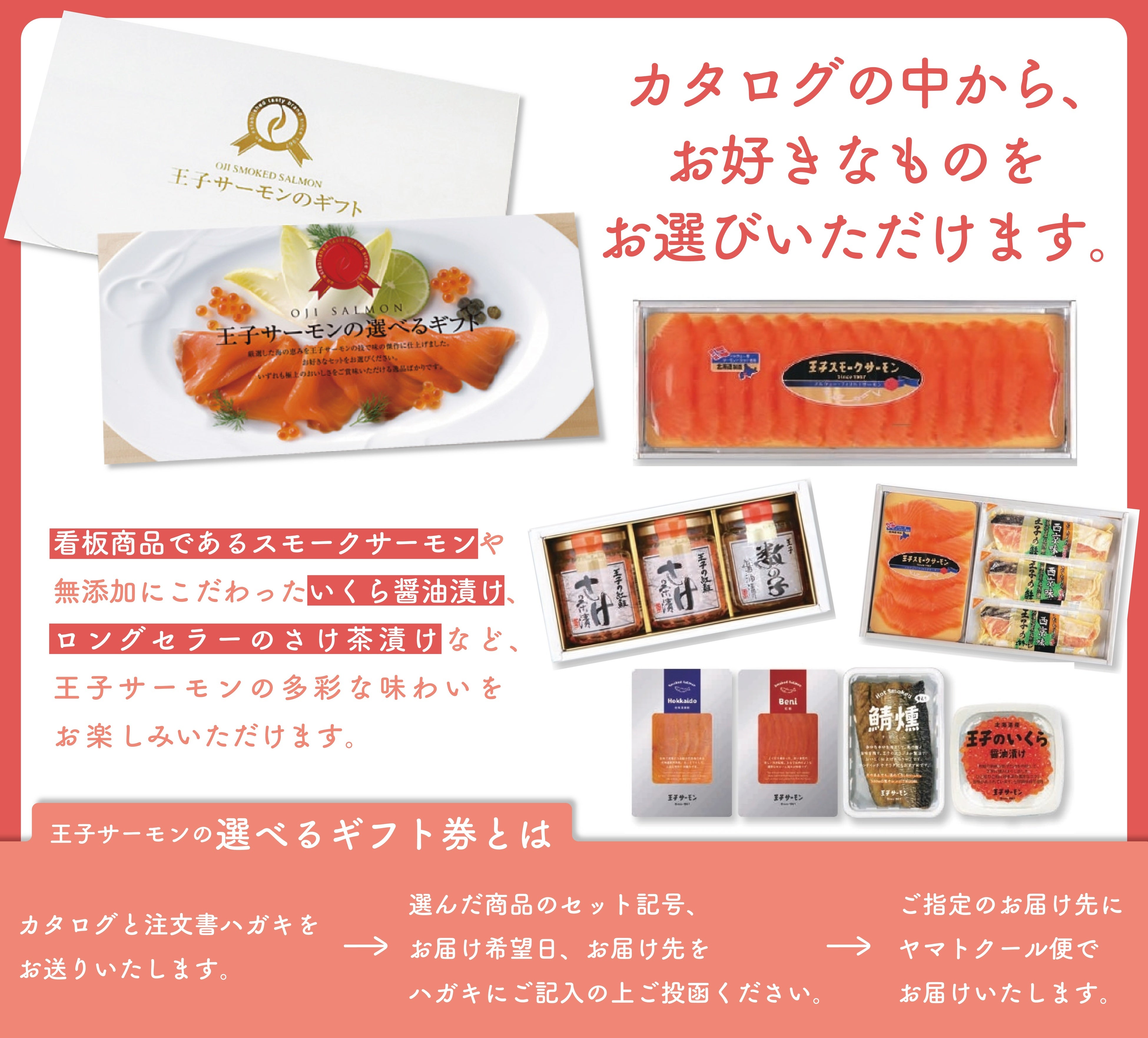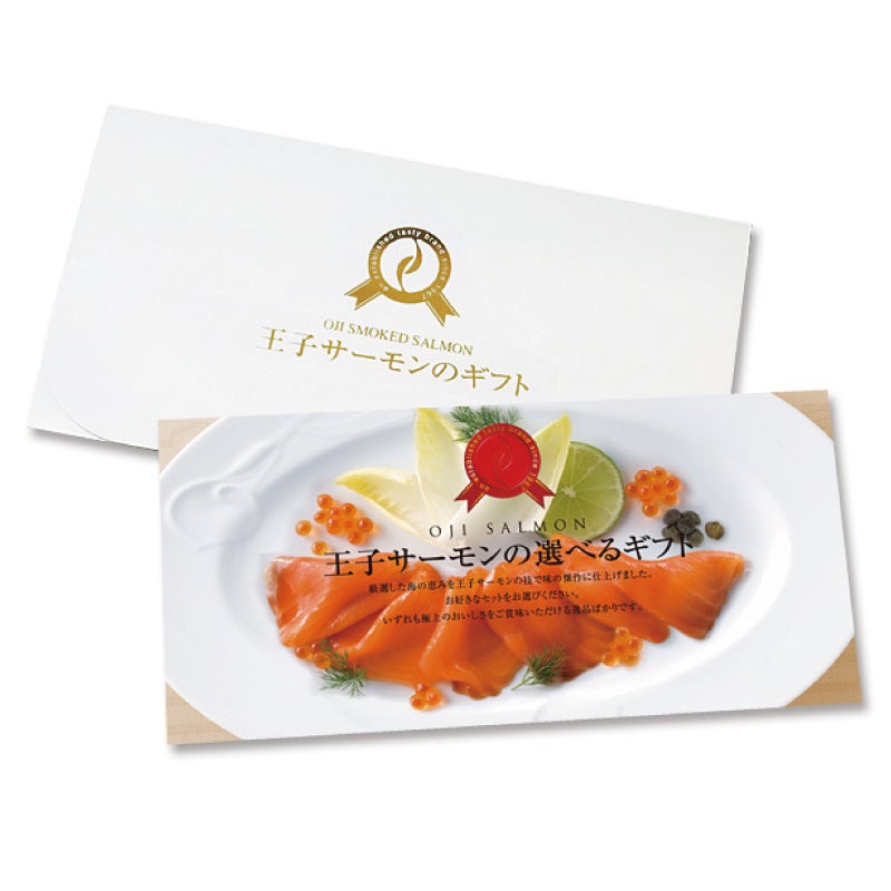 厳選した海の恵みを王子サーモンの技で味の傑作に仕上げた「スモークサーモンスライス」「スモークサーモン・漬魚詰合せ」「スモークサーモン2種・さば温燻・いくら詰合せ」「瓶製品詰合せ」からお好きなものを選べるギフト券。