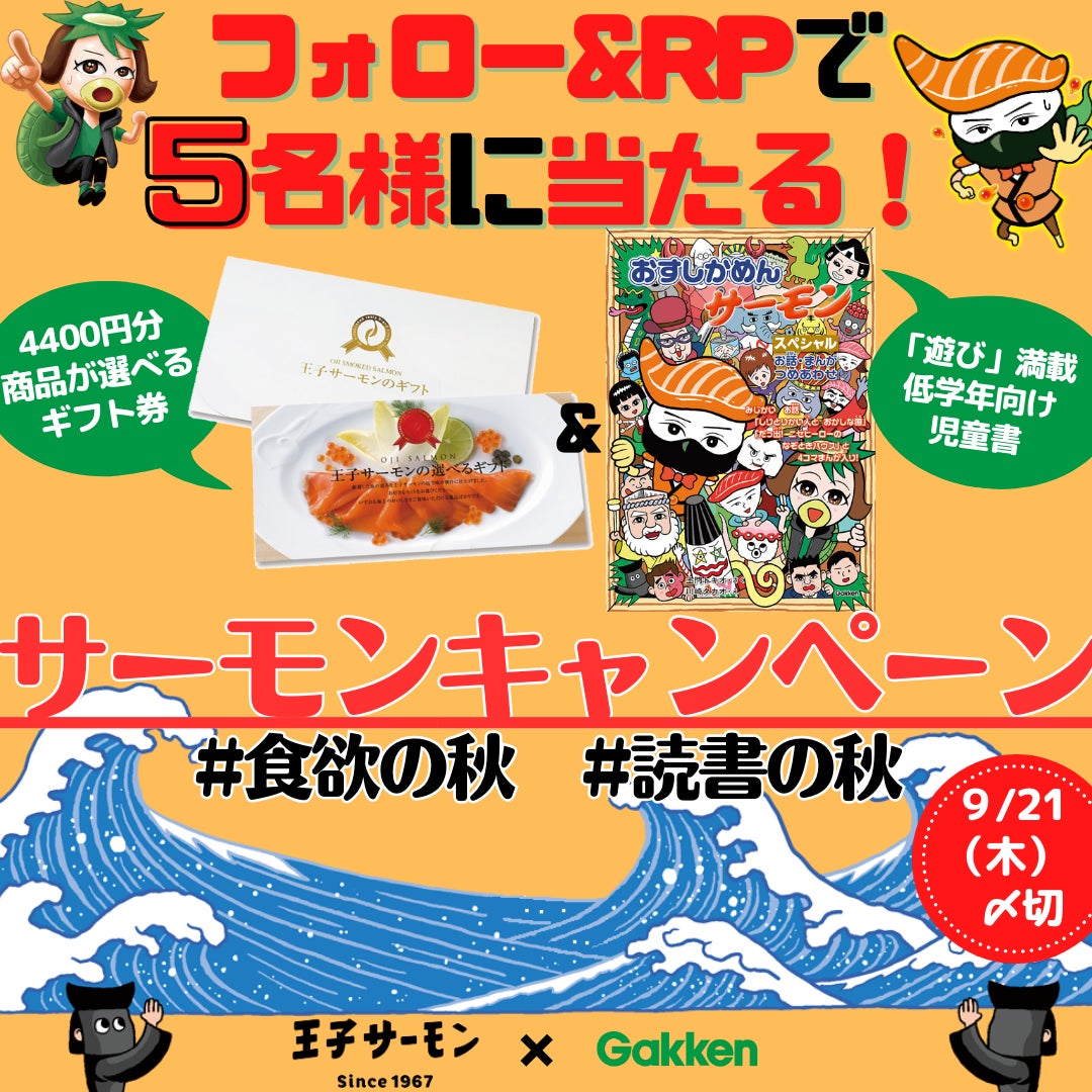 スモークサーモンのトップブランド「王子サーモン」と、Gakkenのコラボレーションが実現。サーモンのお寿司がモチーフの主人公が活躍する児童書「おすしかめんサーモン」シリーズの新刊発売を記念して、「スモークサーモンスライス」や「瓶製品詰合わせ」などの商品を選べるギフト券4,400円分と、書籍『おすしかめんサーモン スペシャル お話・まんがつめあわせ』のセットが抽選でもらえるプレゼントキャンペーンを実施中です。