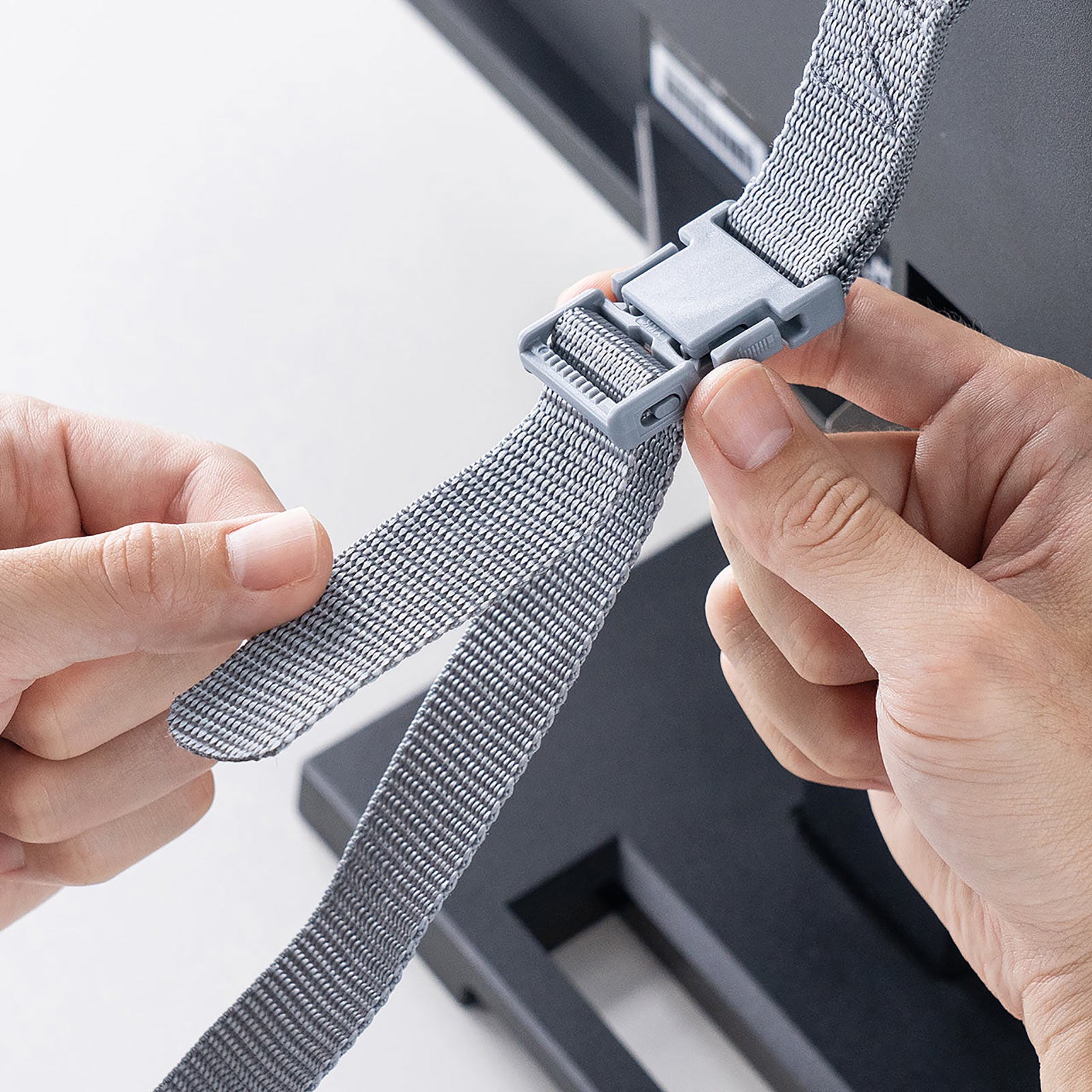 耐震試験済みで震度6強まで対応した直置きモニターを地震による転倒から守ることが出来る着脱バックル付きの転倒防止ベルト