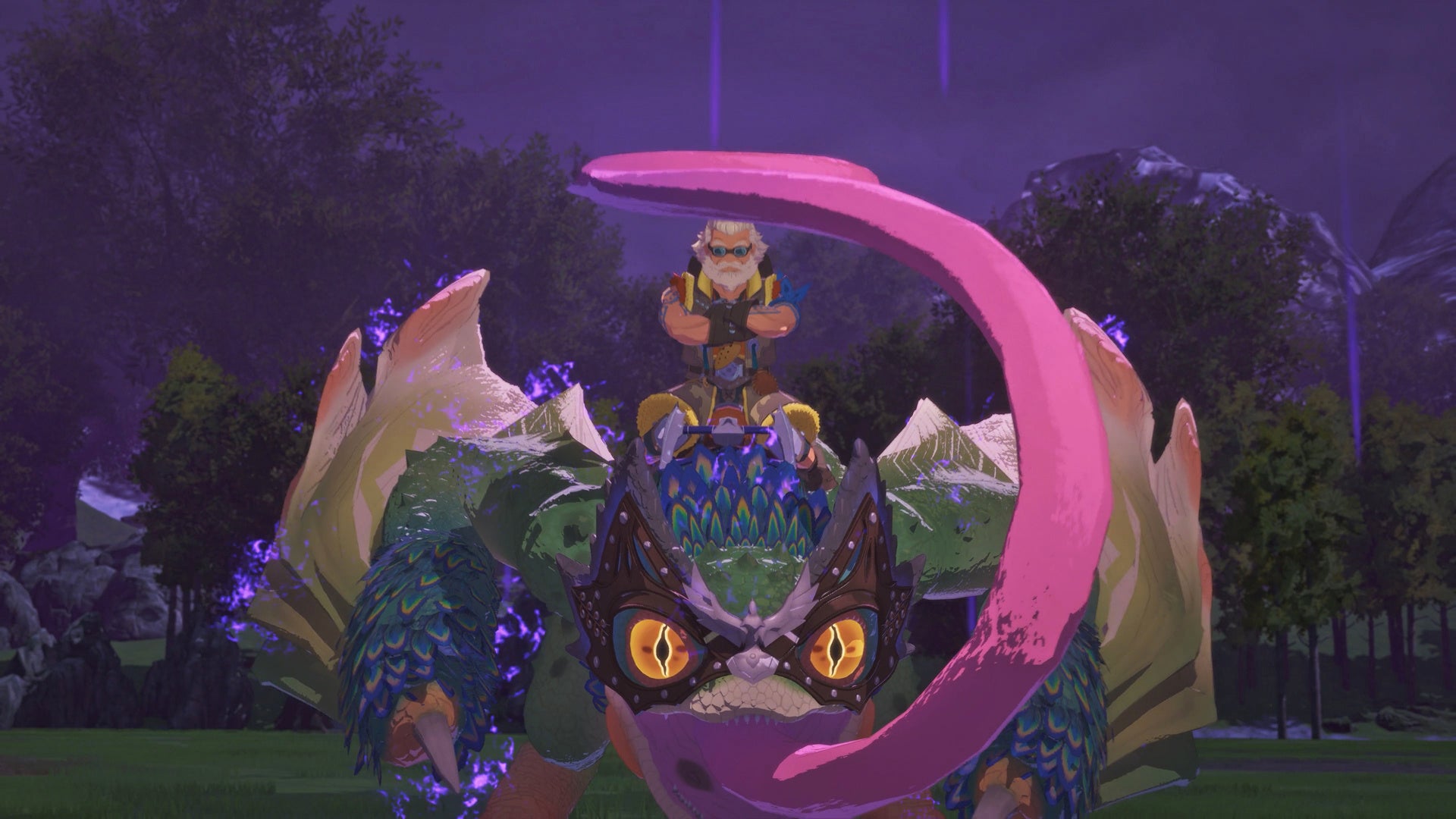 守神ガルク:主人のために身を挺するその献身性から、狗守村では「守神」と崇められている。優れた運動能力と知能を持ち、青い毛並みが特徴の牙獣種。代々、守神ガルクは狗守村に侵攻するモンスターへ果敢に立ち向かっていたが、石化現象による生態系の影響もあり、最後の一頭を残すのみとなってしまった。