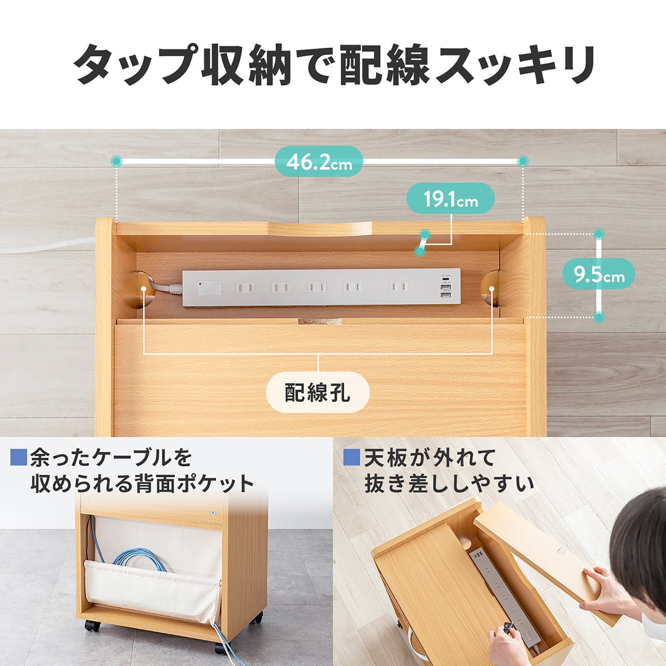 プリンタやルーター、ハブなど、電源を必要とする機器の収納にぴったりな設計。背面や内部に配線孔を完備し、ケーブルをスマートに整理可能。さらにタップ収納スペースもあり、電源まわりのごちゃつきを一気に解消します。