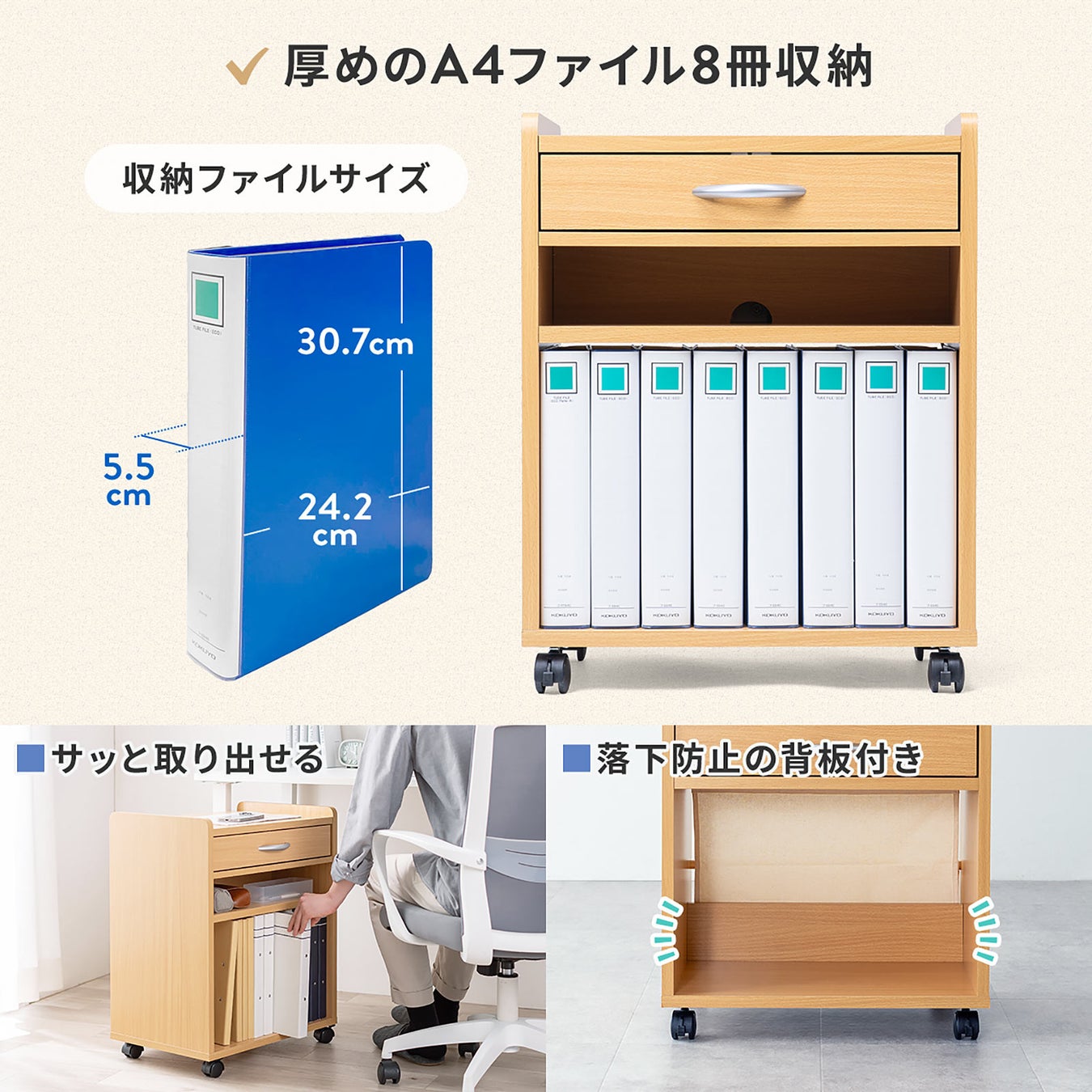 書類や小物、電源タップをまとめて収納できるキャスター付きファイルワゴン