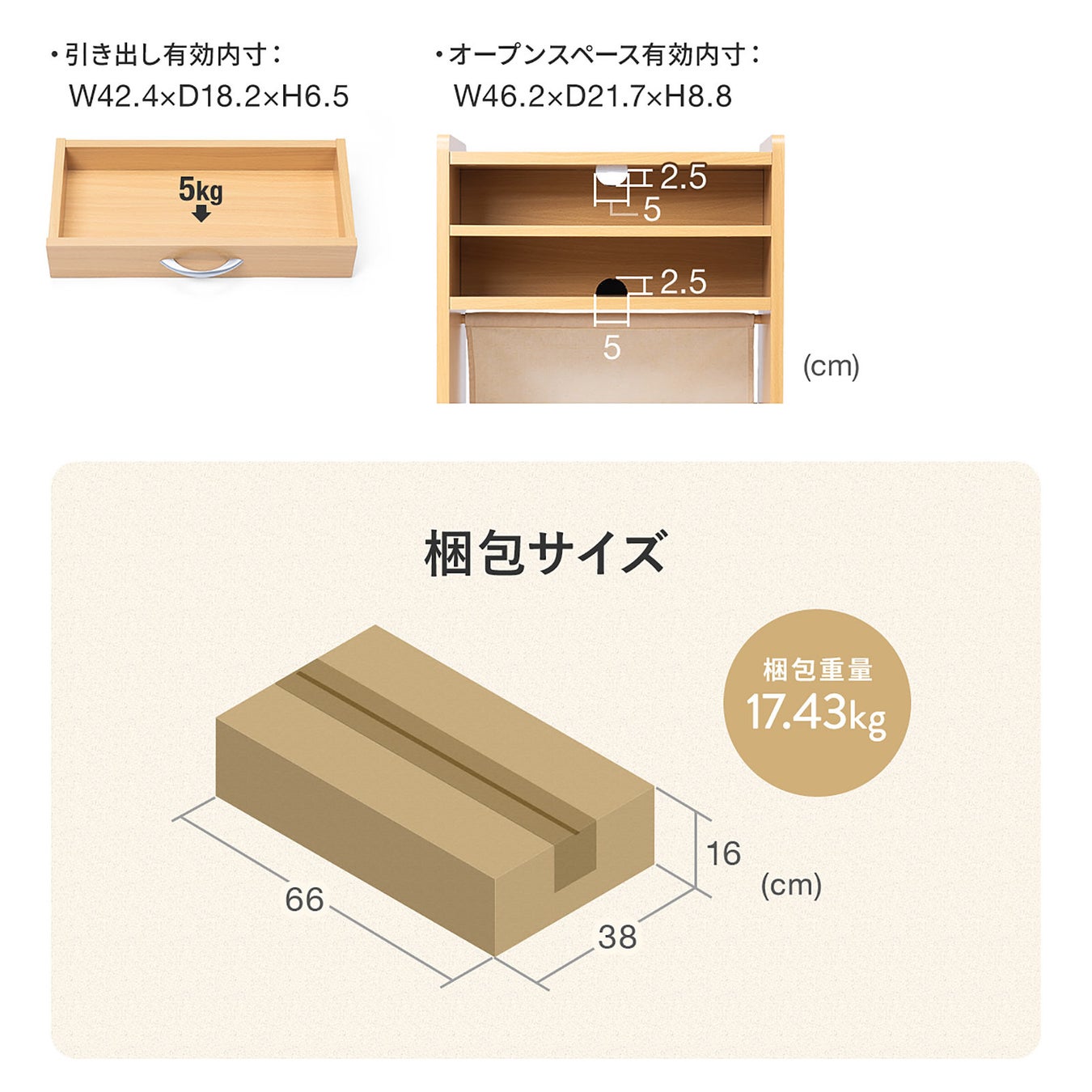 オープン収納にはA4ファイルが横に2つぴったり収まり、必要な書類をすぐ手に取れます。引き出し付きで、文房具や小物、貴重品などもしっかり整理。日常の作業効率を格段にアップさせる収納力です。