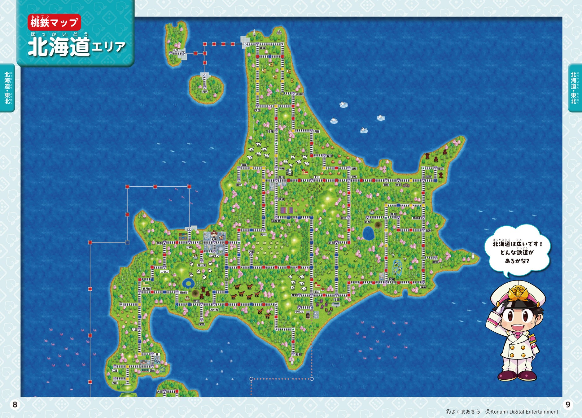 「桃太郎電鉄 ~昭和 平成 令和も定番!~」の地図を、北海道から沖縄まで11のエリアにわけて掲載。それぞれ桃鉄マップと鉄道マップを読みくらべて楽しめるほか、地図の学びにもつながるよう、範囲をそろえてリアルな鉄道マップを掲載しています。それぞれのマップには、「桃太郎電鉄」のキャラクターが登場しています。
