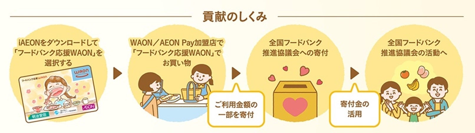 「フードバンク応援WAON」はお買物いただいた売上金額の一部を、イオンと明治安田が「一般社団法人 全国フードバンク推進協議会」に寄付し、その活動に活用していただきます。お客さまご自身の負担なく寄付ができる仕組みとなっています。なお、フードバンク応援WAONは寄付ができるWAON/AEON Payでは初となるスマートフォン限定発行となります。