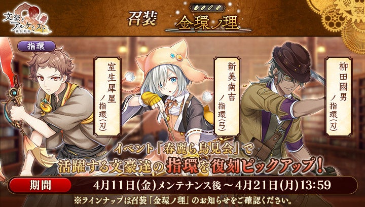 召装『金環ノ理』のラインナップを更新いたしました。この召装では、イベント『調査任務「春麗ら鳥見会」』で活躍する「新美南吉」「柳田國男」「室生犀星」の指環を一定の確率で入手できます。