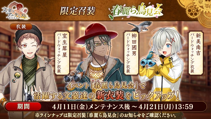 文豪の「衣装」や、会派に装備する事で能力を強化できる「装像」などが入手できるコンテンツ「召装」に、限定召装『春麗ら鳥見会』が期間限定で登場します。この召装では、イベント『調査任務「春麗ら鳥見会」』で活躍する「新美南吉」「柳田國男」「室生犀星」の新衣装を一定の確率で入手できます。