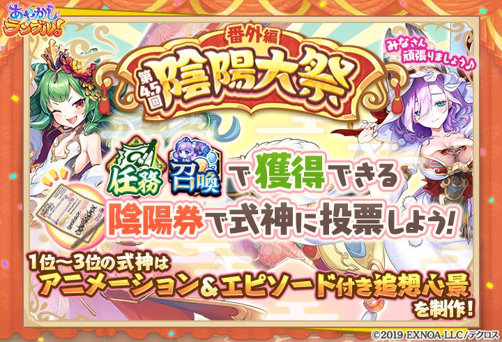 DMM GAMES『あやかしランブル!』にて、新たに期間限定「★5 善如龍王」「★5 妲己」が登場!さらに好きな式神に投票できる「第4.5回陰陽大祭番外編」も開催!