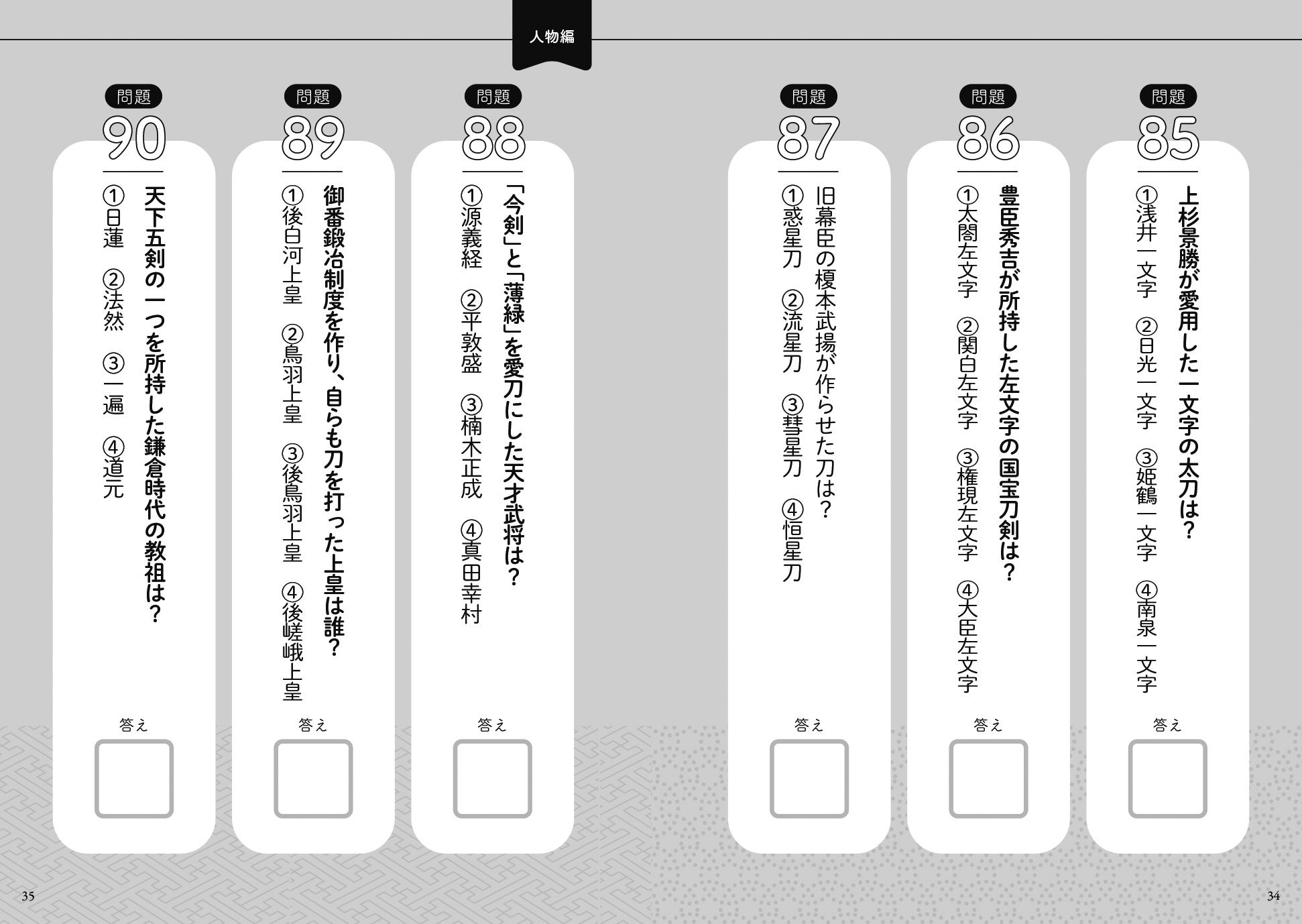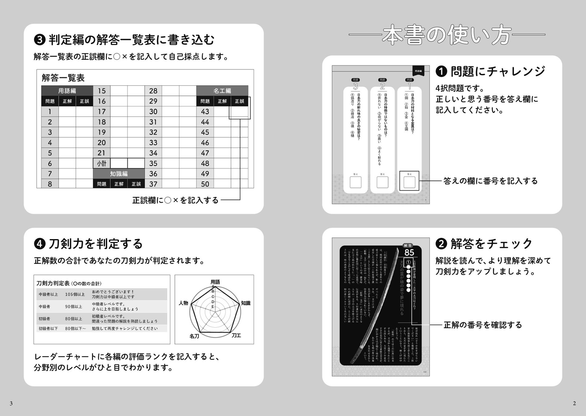 ・本書の使い方より:4択問題にチャレンジ、解答をチェック、巻末の判定編の一覧表に書き込み、あなたの刀剣力を判定します。
