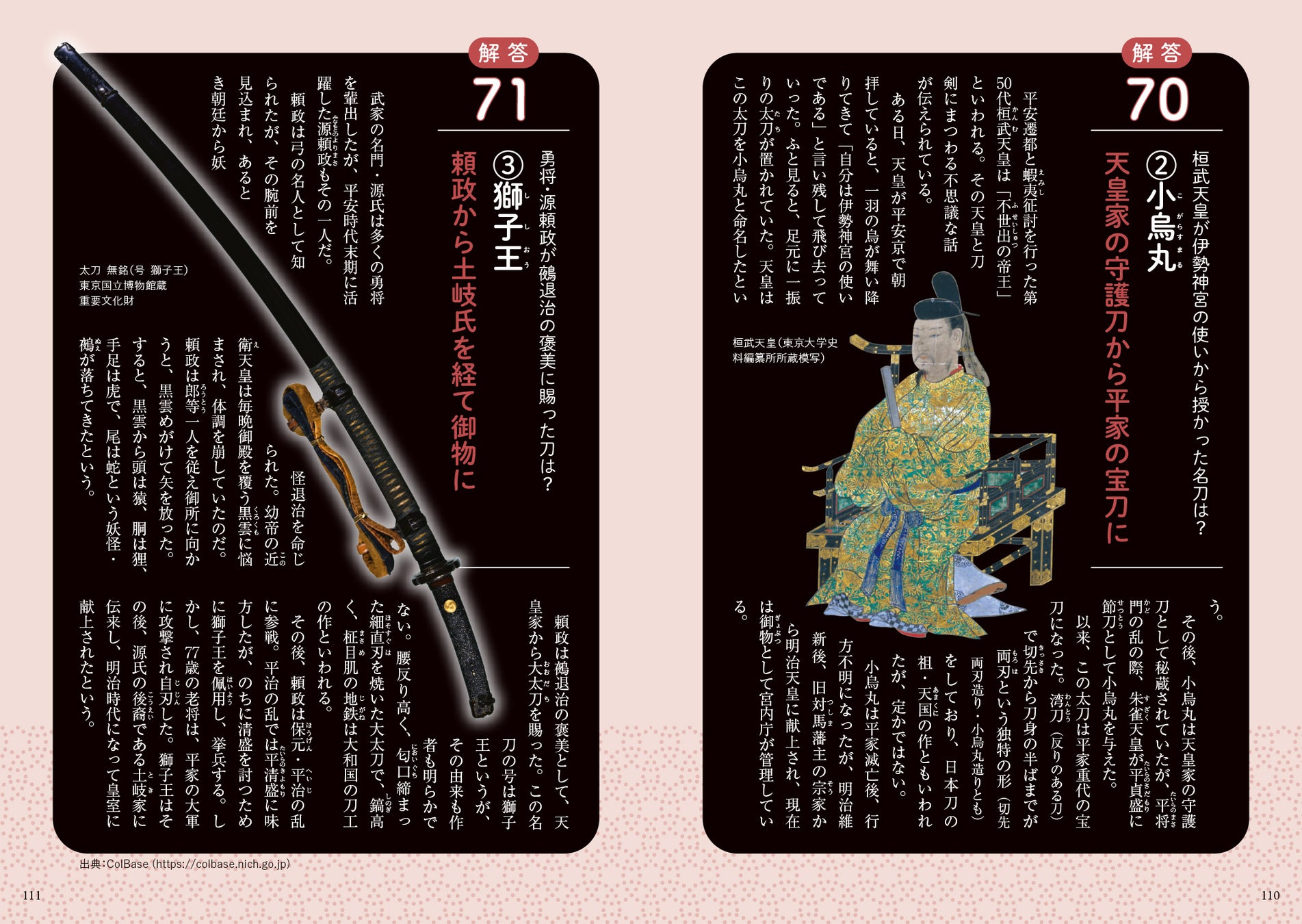 「日本刀の材料となる金属は?」「小丸、火焔、地蔵と言えば刀の何の種類?」「刃文と鎬筋の間にぼんやり白く影のように見える働きは?」「刀剣王国を築いた備前長船の始祖は?」「豊臣秀吉が所持した左文字の国宝刀剣は?」……など、用語編・知識編・名工編・名刀編・人物編の5つのジャンルに分けて問題と解答・解説を掲載。全部で111問の4択問題が出題され、その正解数で刀剣力のレベルをチェックできるようになっています。たとえ間違っても解説を読むことで刀剣知識を深められるはずです。あなたの刀剣力がどのくらいか、チャレンジしてみてはいかが?