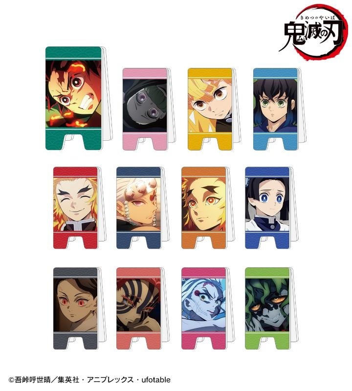 竈門炭治郎、竈門禰󠄀豆子、我妻善逸、嘴平伊之助、煉󠄁獄杏寿郎、宇髄天元、煉󠄁獄千寿郎、神崎アオイ、鬼舞辻󠄀無惨、猗窩座、堕姫、妓夫太郎の印象的なシーンを立て看板風のアクリルメモスタンドに仕上げました。