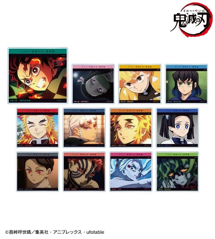 竈門炭治郎、竈門禰󠄀豆子、我妻善逸、嘴平伊之助、煉󠄁獄杏寿郎、宇髄天元、煉󠄁獄千寿郎、神崎アオイ、鬼舞辻󠄀無惨、猗窩座、堕姫、妓夫太郎の印象的なシーンをアクリルカードに仕上げました。