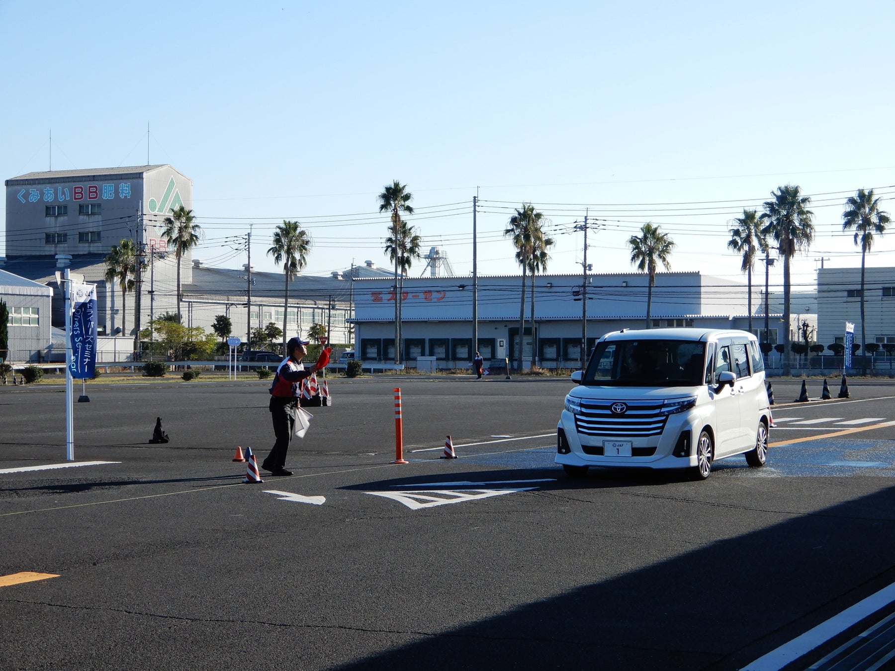 ジグザグ運転によって、ハンドル操作やクルマの挙動などを確認します。