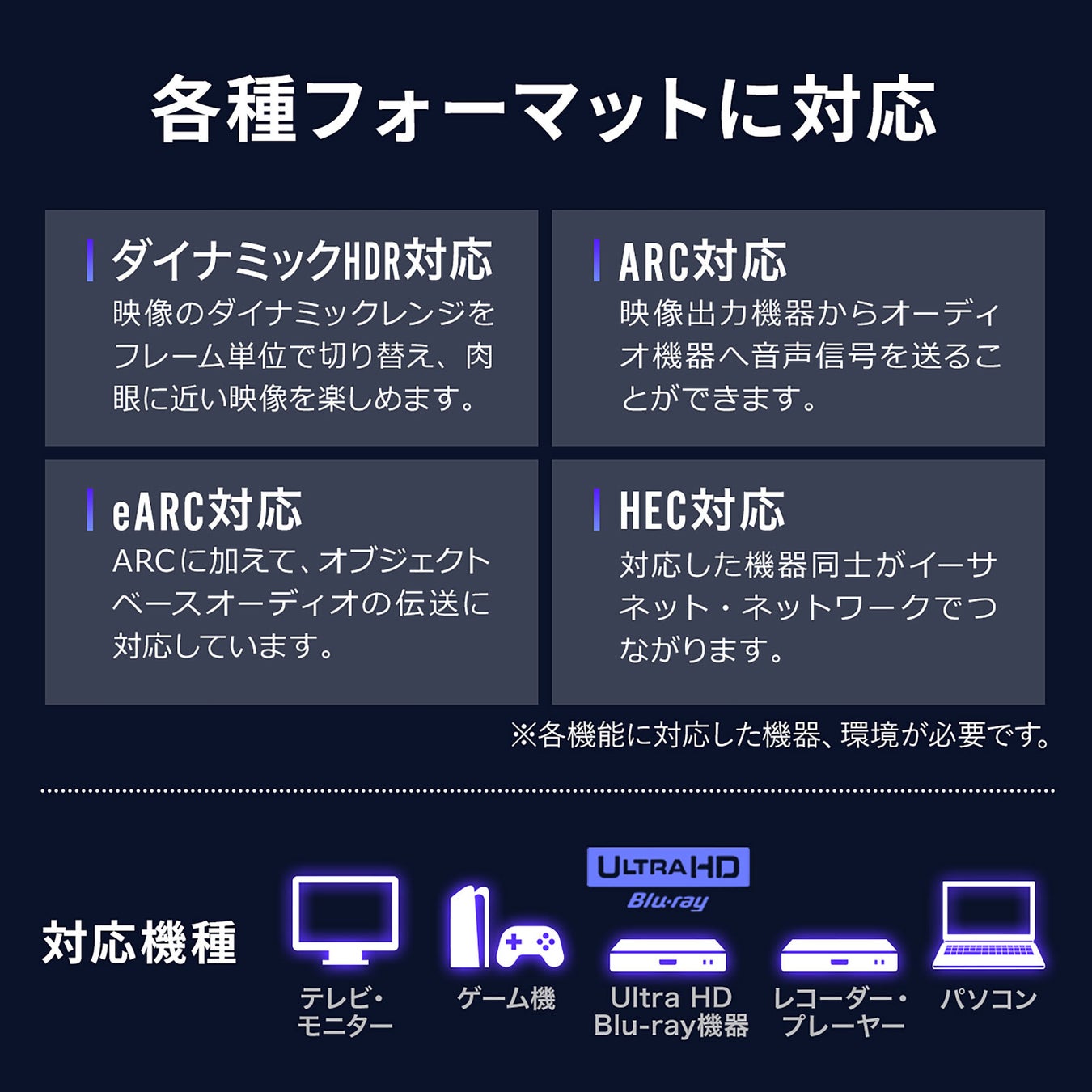 HDCP2.3、HDR、eARC、HECなどの各種規格に対応しています。Fire TV StickやNintendo Switchなどをテレビやモニターに接続する際にも最適です。