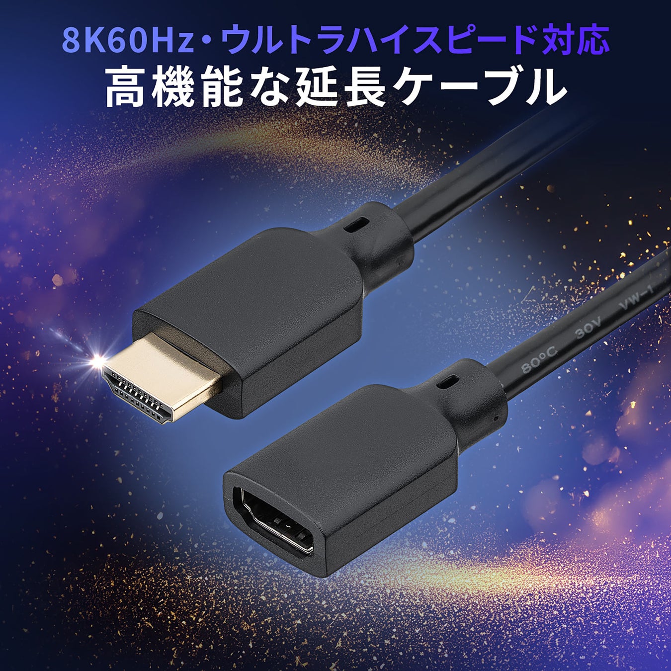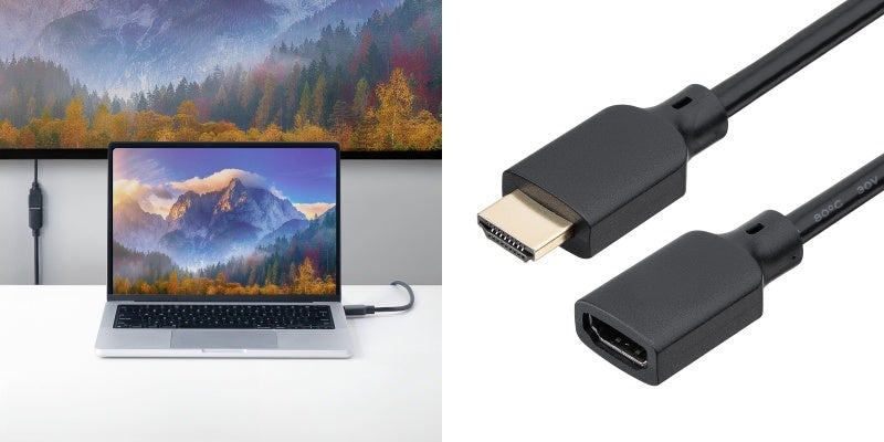 ケーブルの長さ不足や隣接ポートとの干渉などを解消でき、頻繁な抜き差しによる機器ポートの損傷も防ぐことができる8K60Hz・4K120Hz対応のHDMI延長ケーブル