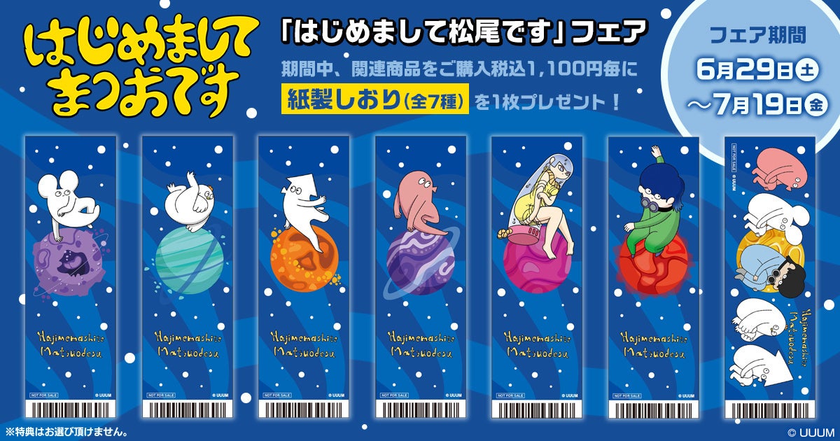全国アニメイト・アニメイト通販・ムービック通信販売にて6月29日から7月19日まで開催される、「はじめまして松尾です」フェアでは、期間中、関連のキャラクターグッズを1,100円(税込)お買い上げ毎に、1枚しおりをプレゼントいたします。しおりの種類は全部で7種。