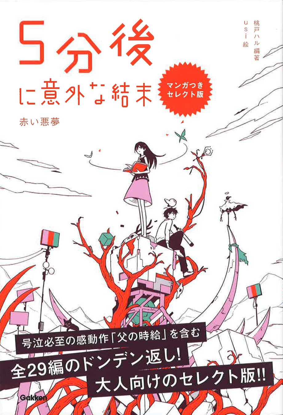 『5分後に意外な結末 赤い悪夢 マンガつきセレクト版』には感動作「父の時給」、『5分後に意外な結末 青いミステリー マンガつきセレクト版』にはドラマ化もされた「うそつき」と、それぞれ代表作を含む29編を収録。