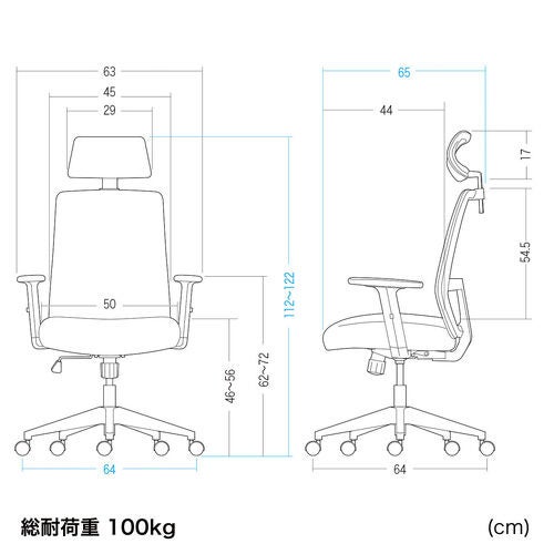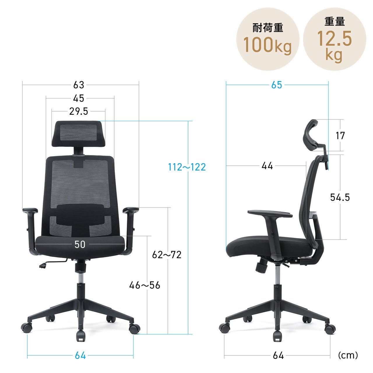 本製品のサイズは幅64×奥行65×高さ112~122cm、 重量は12.5kgです。