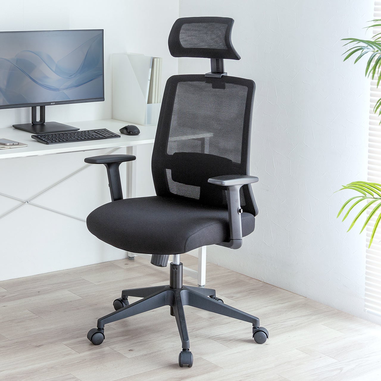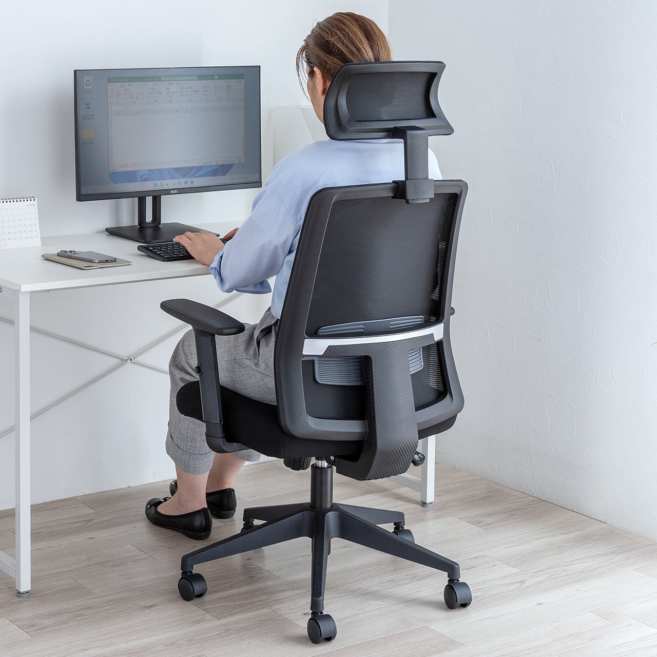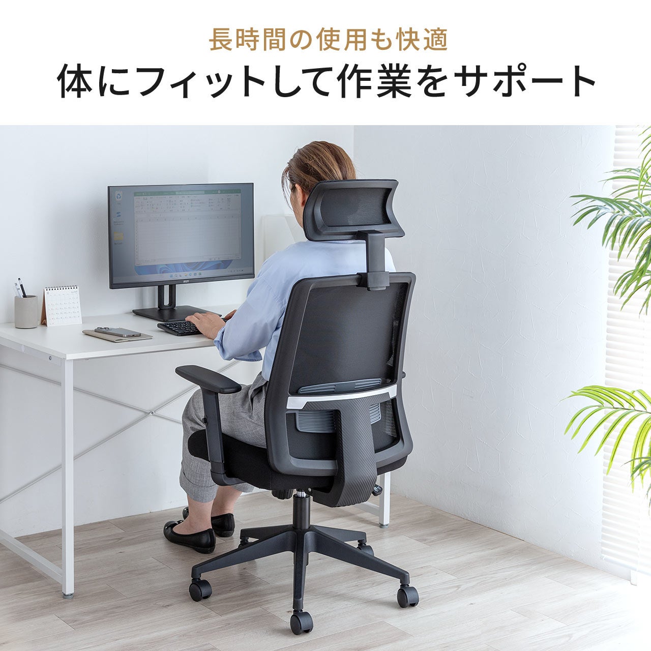 本製品は、しっかりと体を支えるミドルバック仕様で、長時間のデスクワークも快適に使用できます。
