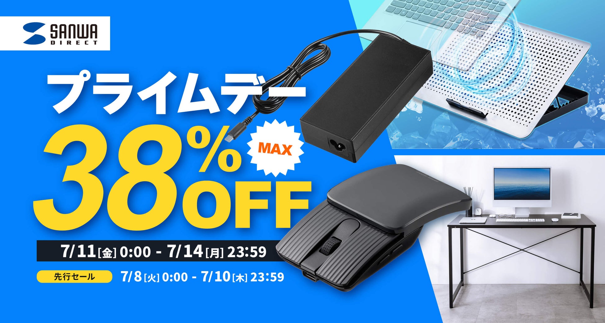 サンワサプライ株式会社(本社:岡山市北区田町1-10-1、 代表取締役社長 山田 和範)が運営するサンワダイレクト Amazon店は、Amazonで7月8日(火)0:00から7月10日(木)23:59まで開催される「プライムデー先行セール」及び、7月11日(金)0:00から7月14日(月)23:59まで開催される「Amazon プライムデー」において1813製品が最大38%OFFになるタイムセールを開催いたします。