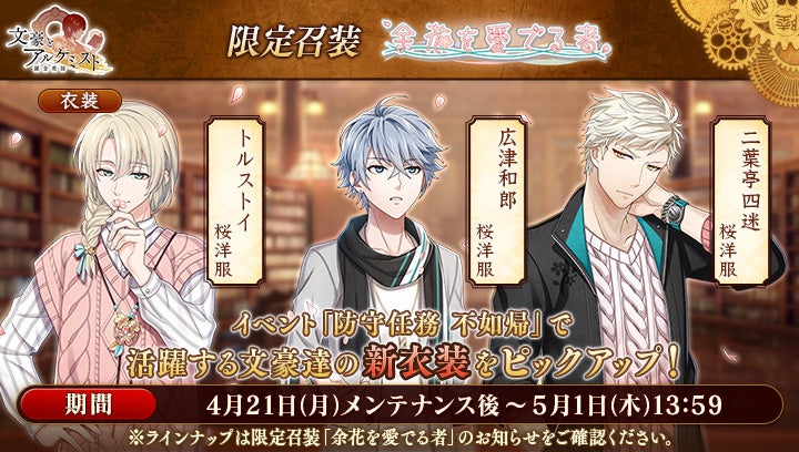さらに、イベントと同時に開催される限定召装『余花を愛でる者』にて新規追加された「広津和郎」「トルストイ」「二葉亭四迷」の〈桜洋服〉を編成すると、得点の獲得率がそれぞれ30%上昇します。