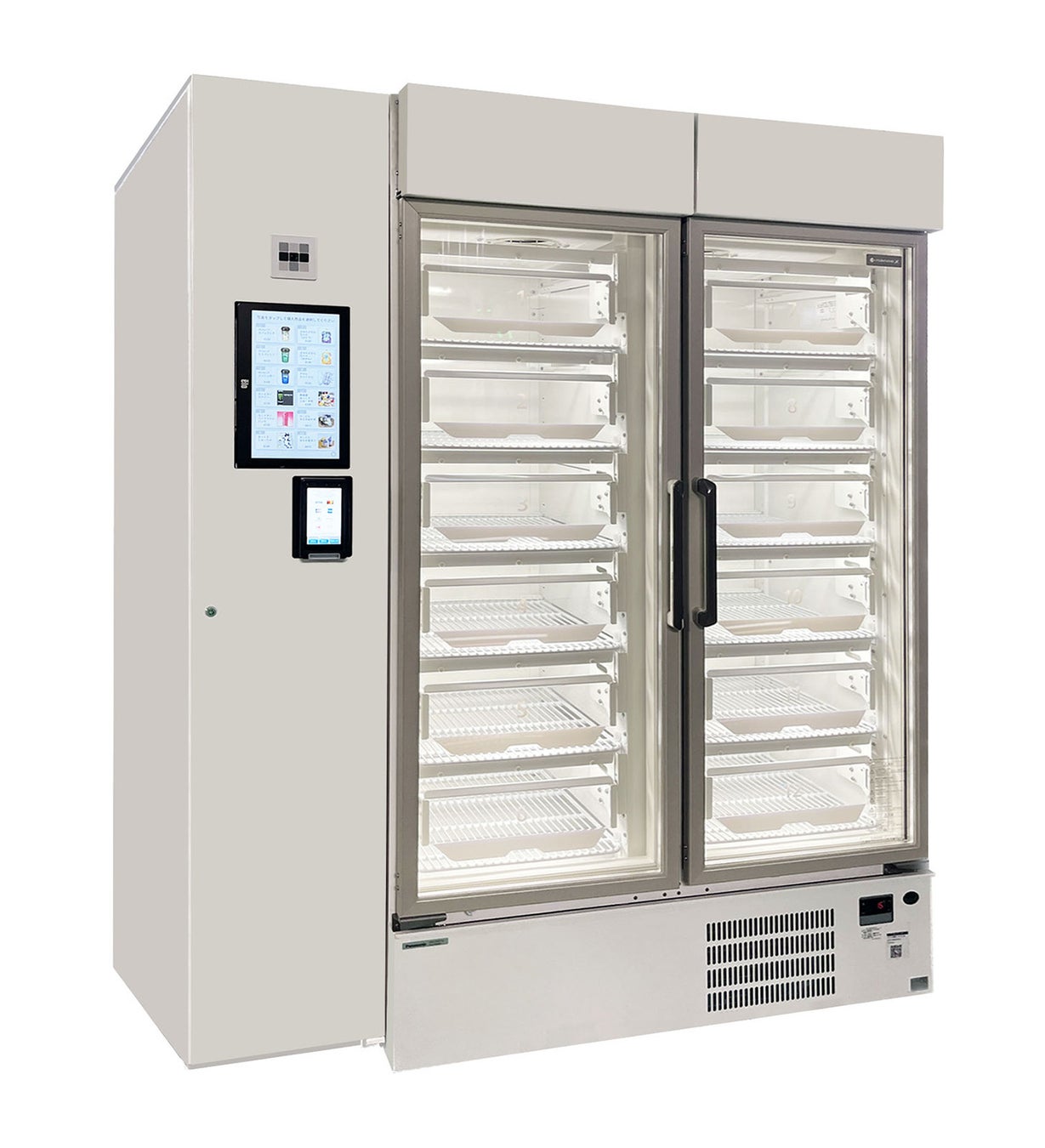 今回使用する「決済型冷蔵スマートショーケース(仮称)」は、本体のタッチパネルで購入する商品を選択し、セルフレジでキャッシュレス決済を完了した後、二重扉構造の外扉と購入した商品の内扉が開錠され、商品を取り出すことができる仕様です。