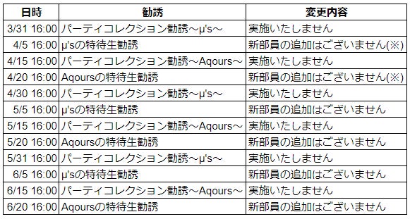 9周年特別バージョンのイベント開催に伴い、特待生勧誘(μ's、Aqours)およびパーティコレクション勧誘(μ's、Aqours)の実施予定について、下記の通り変更を行います。