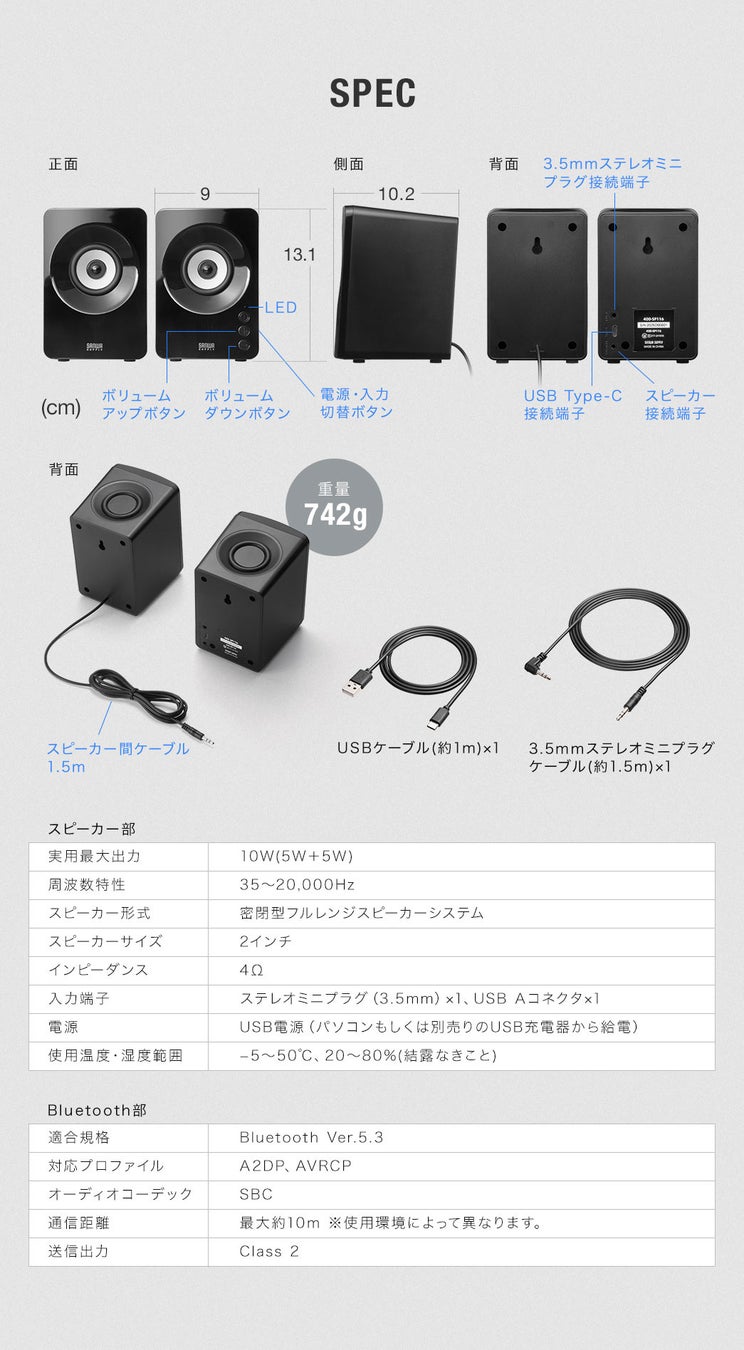 Bluetooth・USB・3.5mmステレオミニプラグの3つの接続に対応し、コンパクトで置き場所に困らない最大出力10W対応のスピーカー