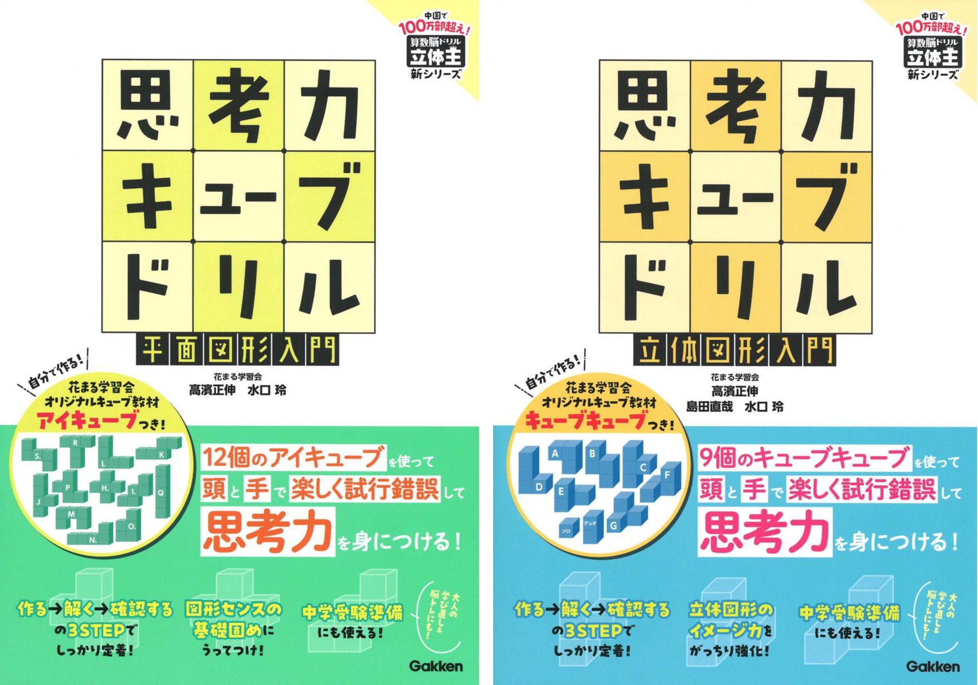「平面図形入門」は、12個の“アイキューブ”という教材を使って平面図形問題を解きながら、思考力と図形センスの基礎固めができます。「立体図形入門」は、9個の“キューブキューブ”という教材を使って立体図形問題を解きながら、思考力と立体図形のイメージ力を強化できます。