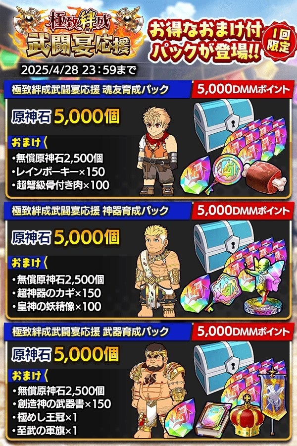 さらに、レインボーキーや超神器のカギ、極めし王冠といった育成アイテムがセットになった「極致絆成武闘宴応援育成パック」も3種登場!期間限定のこの機会をお見逃しなく。