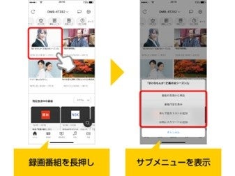 ホーム画面で番組サムネイルを長押しタップすると、サブメニューを表示します。サブメニューから番組の予約や保存、番組内容の表示などが行えるため、より直感的な操作が可能になります。(※5)