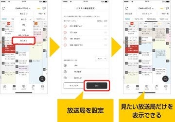 番組表に表示する放送局を自由に選択できる「カスタム番組表」を設定できます。地上デジタル・BS・CS・新4K衛星放送の混在が可能で、有料放送も含めて自分が見たいチャンネルだけの番組表を作ることができます。