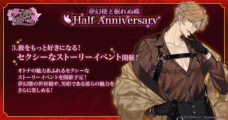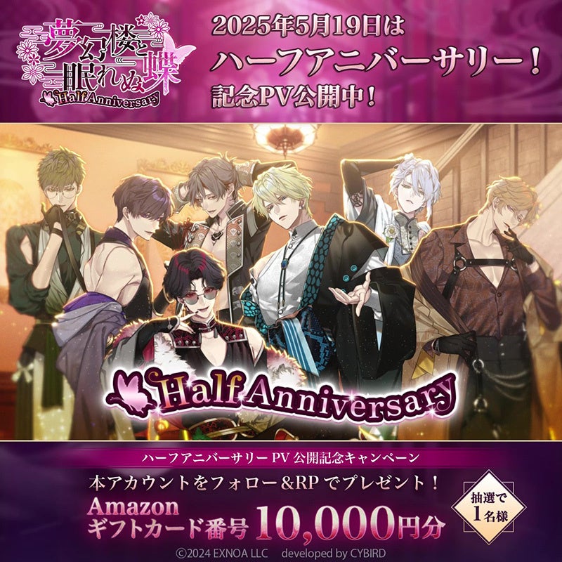 DMM GAMESを運営する合同会社EXNOA(本社:東京都港区、CEO:村中 悠介、URL:https://games.dmm.com/)は、オトナの女性向け恋愛ゲーム「夢幻楼と眠れぬ蝶」にて、2025年5月19日(月)のハーフアニバーサリーを記念したキャンペーンの開催をお知らせいたします。