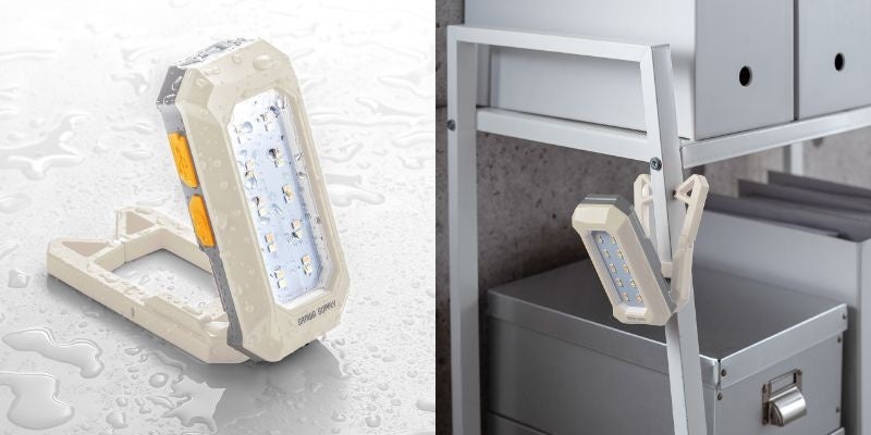 防塵・防水性能はIP54準拠。粉塵が舞う現場や突然の雨にも耐えられるため、屋外作業やガレージ作業、アウトドアレジャーなど、天候に左右されず安心して使用可能。耐久性も高く、長く愛用できるタフな設計です。