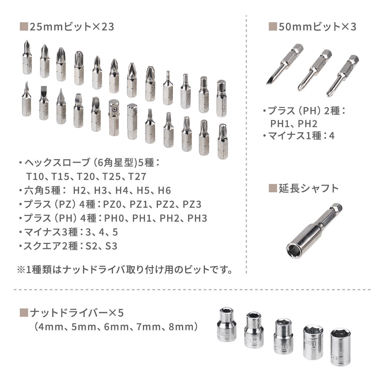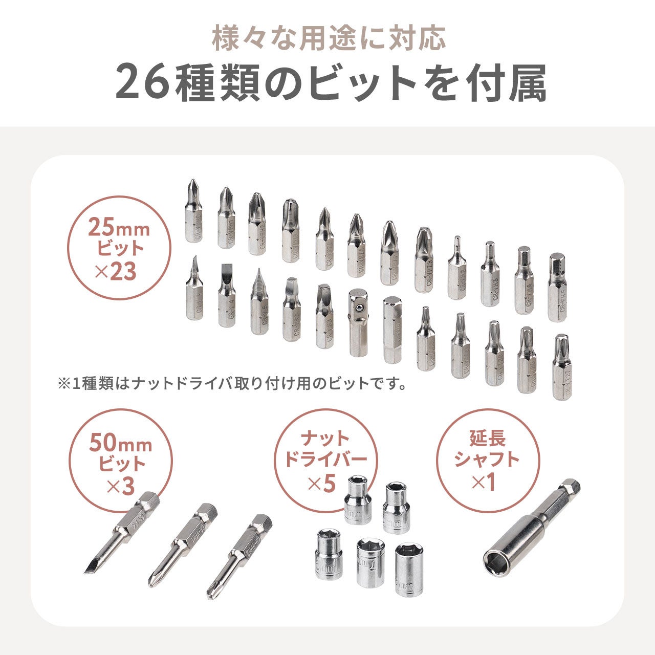 ・26種類のビット+5つのナットドライバー+延長シャフトまで付属