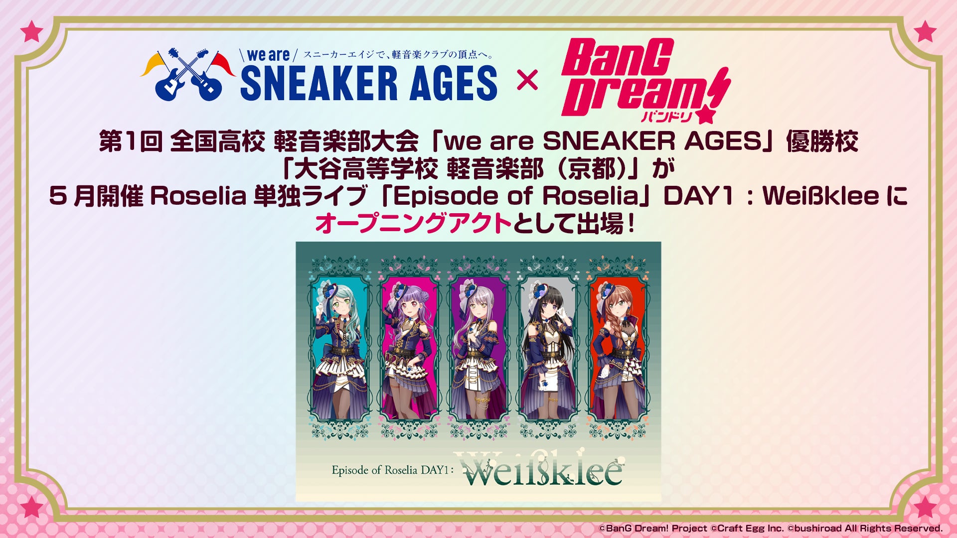 さらに、昨年開催された第1回全国高校軽音楽部大会「we are SNEAKER AGES」優勝校の「大谷高等学校 軽音楽部(京都)」が、5月21日(土)に富士急ハイランド・コニファーフォレストにて開催されるRoselia単独ライブ「Episode of Roselia」DAY1 : Weißkleeにオープニングアクトとして出場することが決定した。