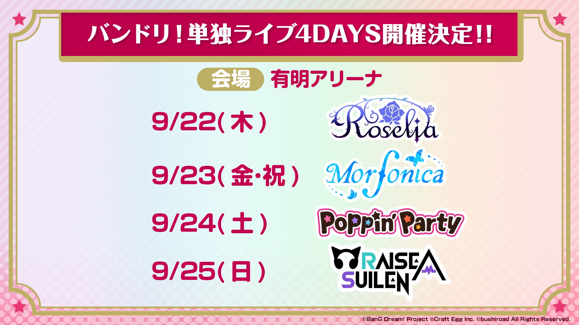 2022年9月に、有明アリーナにてPoppin’Party、Roselia、Morfonica、RAISE A SUILENによる単独ライブ4DAYSの開催が決定。