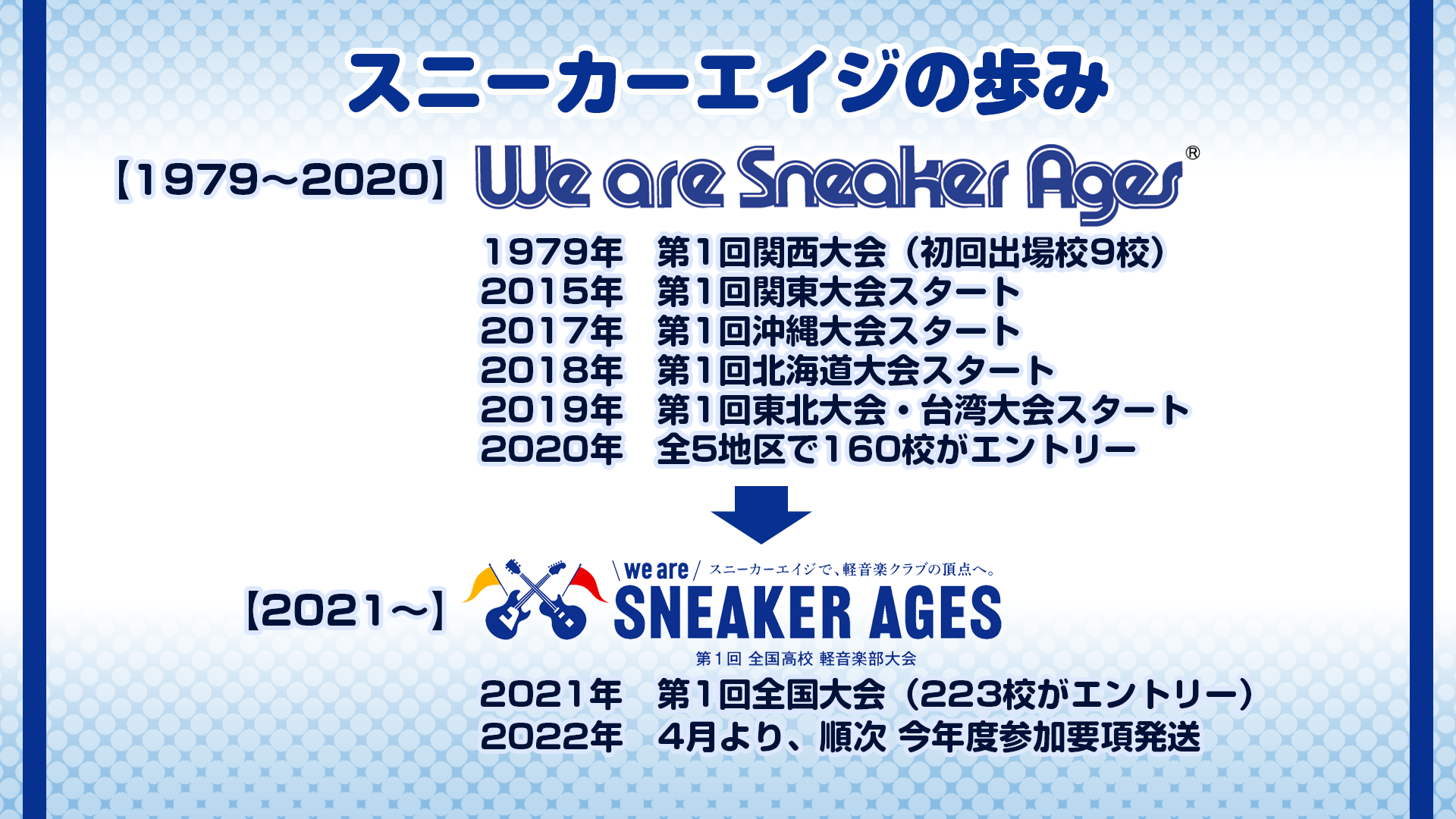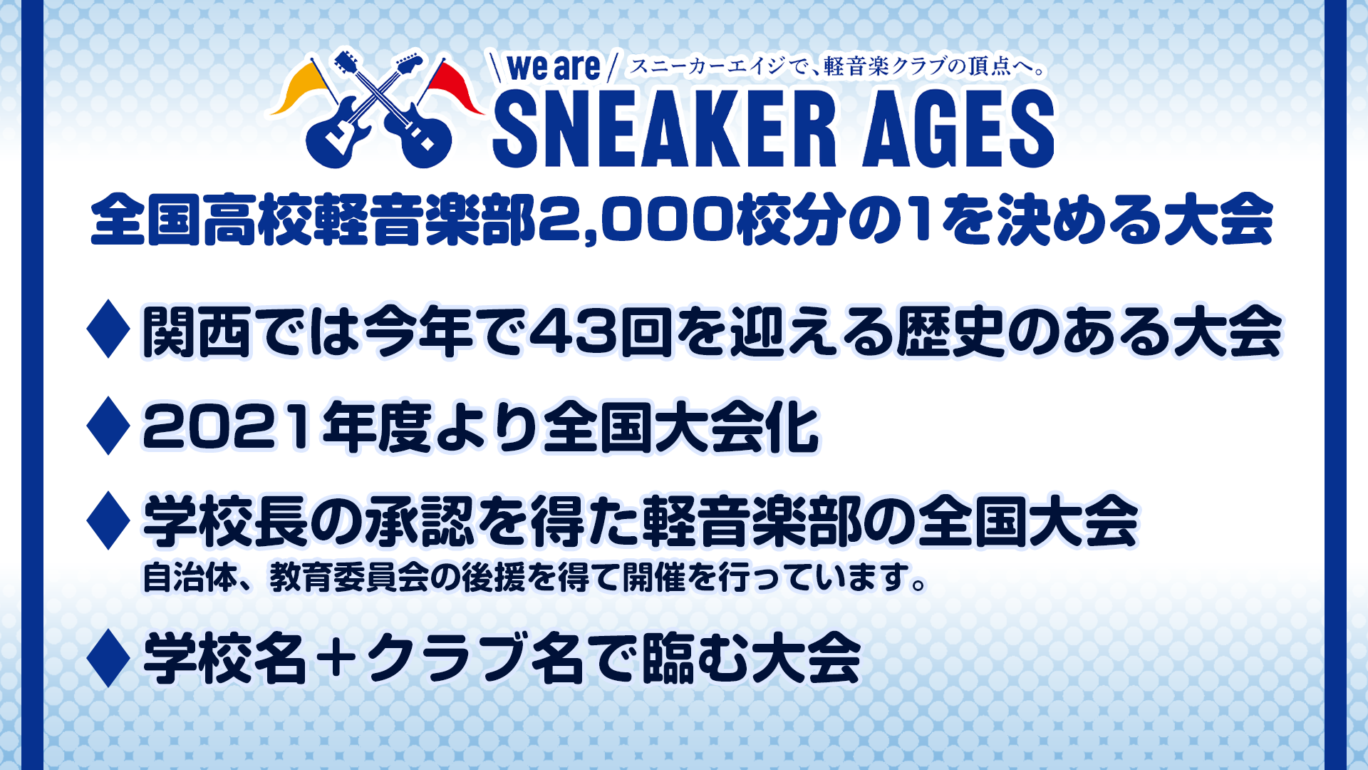 全国高校軽音楽部2000校分の1を決める大会、第2回全国高校軽音楽部大会「we are SNEAKER AGES」が今年も開催決定。全国大会は2022年12月25日(日)にグランキューブ大阪 メインホールで実施予定。夏以降に各地区グランプリ大会の開催を予定している。