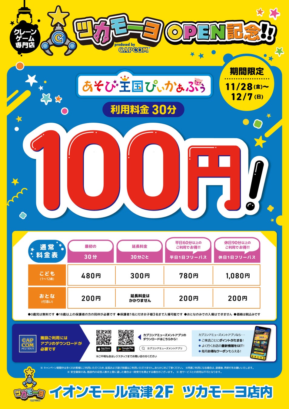 「ツカモーヨ」のオープンを記念して、店内に併設している、お子様向けの屋内遊具施設「あそび王国ぴぃかぁぶぅ 富津店」が期間限定で100円でご利用できるイベントを実施いたします。