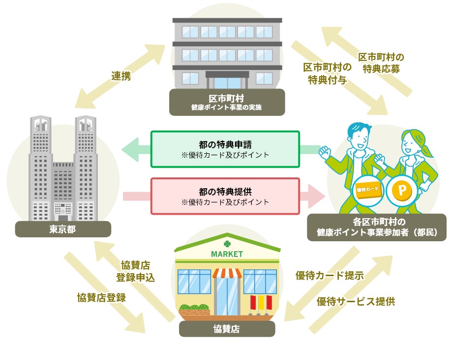 東京都は、社会全体で都民の健康づくりを支援するため、区市町村の健康ポイント事業と連携し、事業に参加して一定の健康ポイントを貯めた参加者に、区市町村からの特典に加えて、都内協賛店で利用可能な優待カード等の特典を提供する「東京健康UPlus(とうきょう健康応援事業)」の実施に向けて準備を進めています。