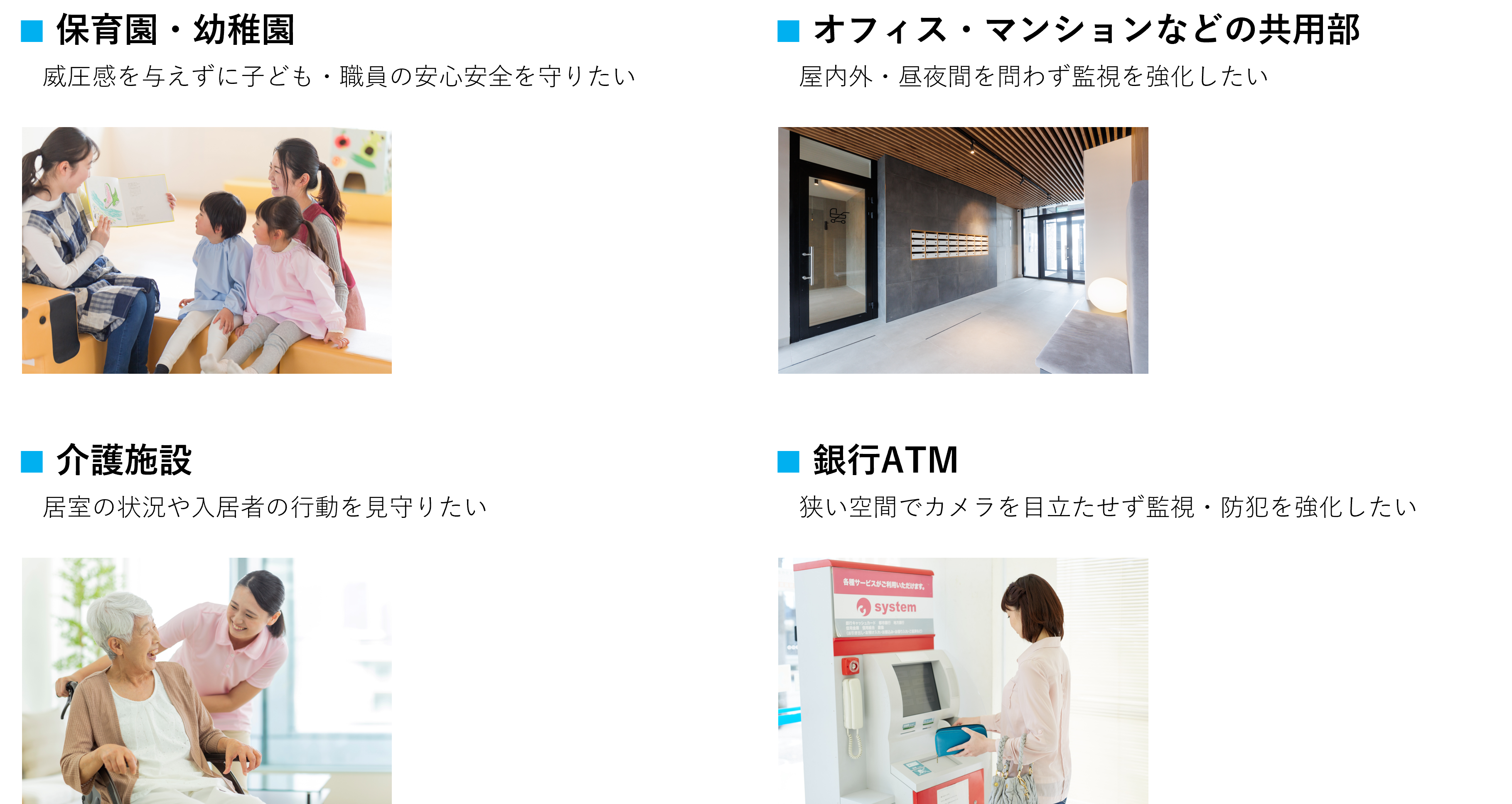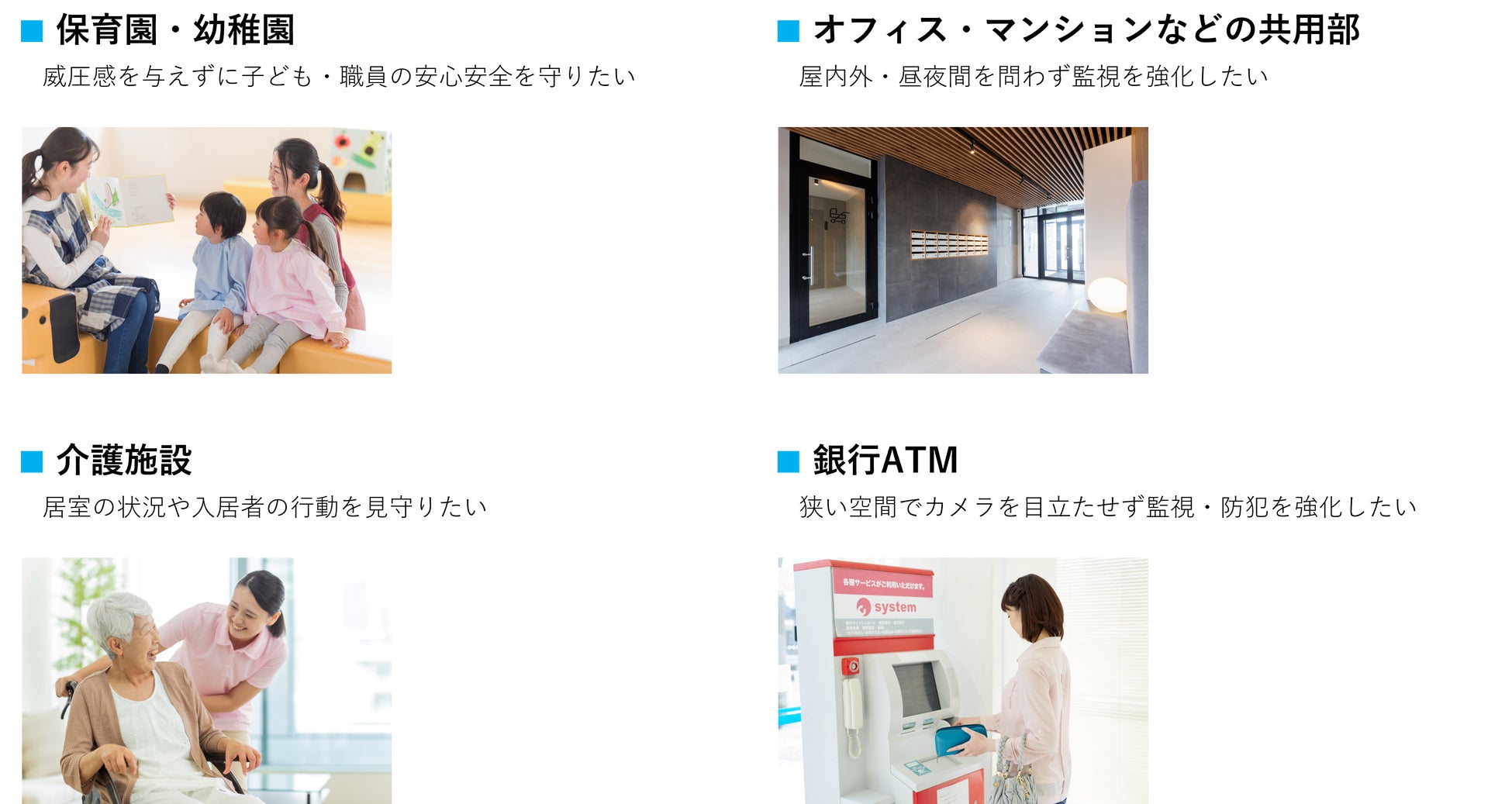 昨今、保育園・幼稚園での不適切保育や不審者の侵入などが相次ぎ、子どもや職員の安心・安全を守ることへの関心が高まっています。また、オフィス、店舗、介護施設など様々な場所で空間のデザインが重視されるようになり、景観を乱さないカメラのニーズが生まれてきています。